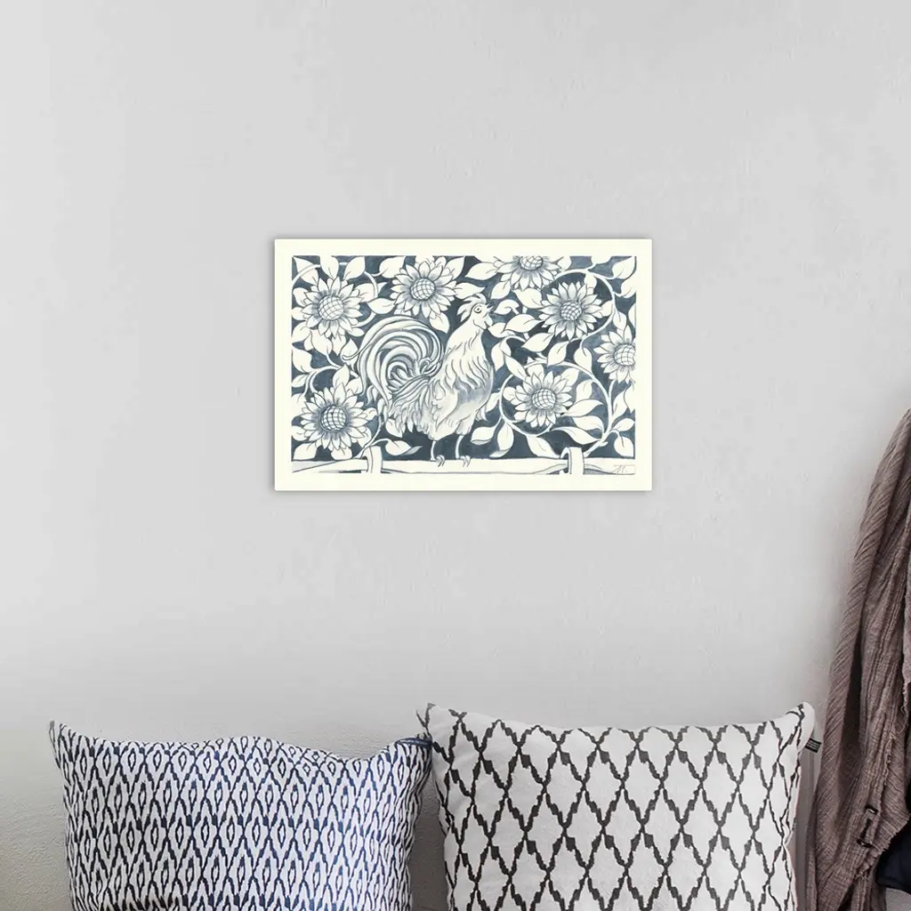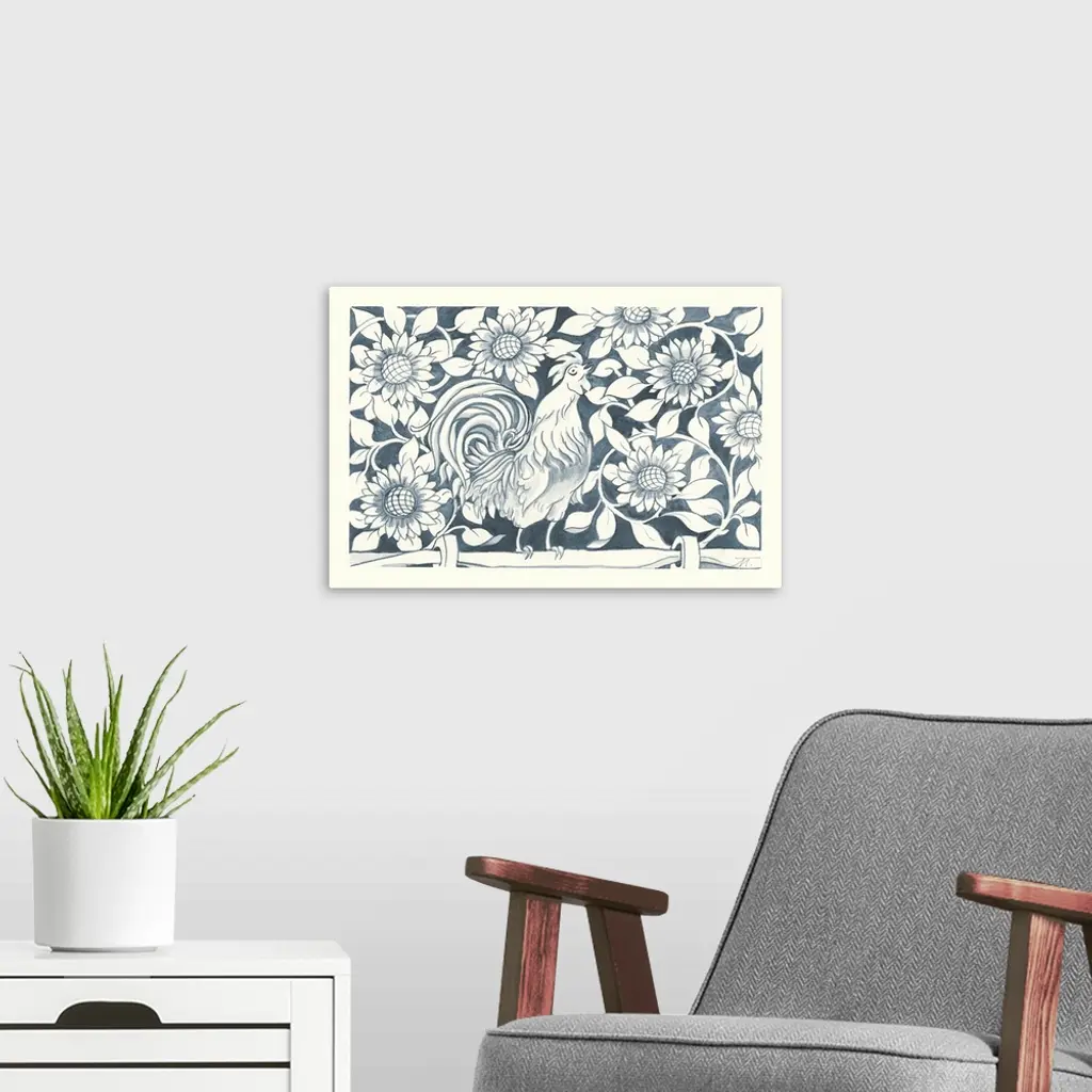 Floral indigo and white watercolor painting with a rooster crowing on a fence post.
