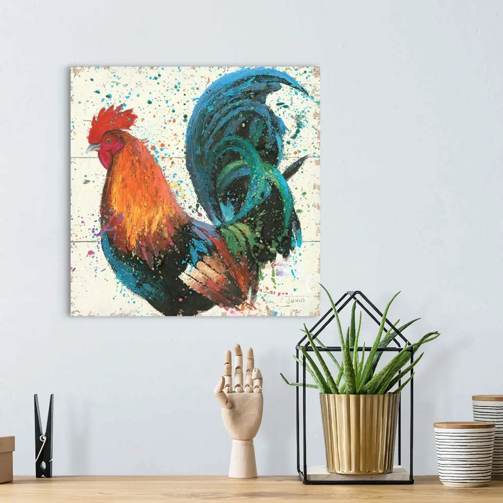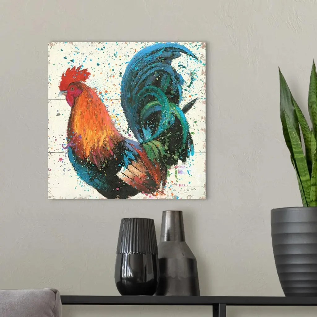 Contemporary painting of a colorful rooster embellished with paint splatters.