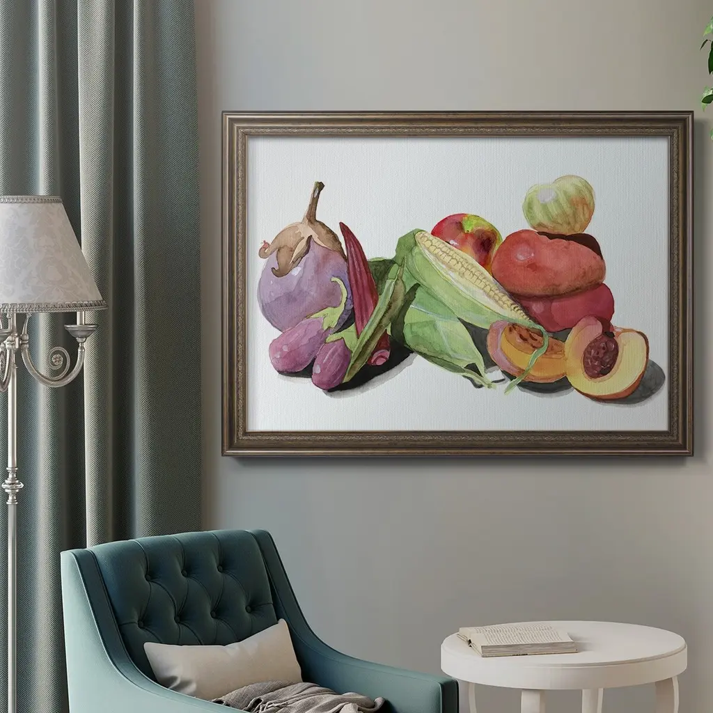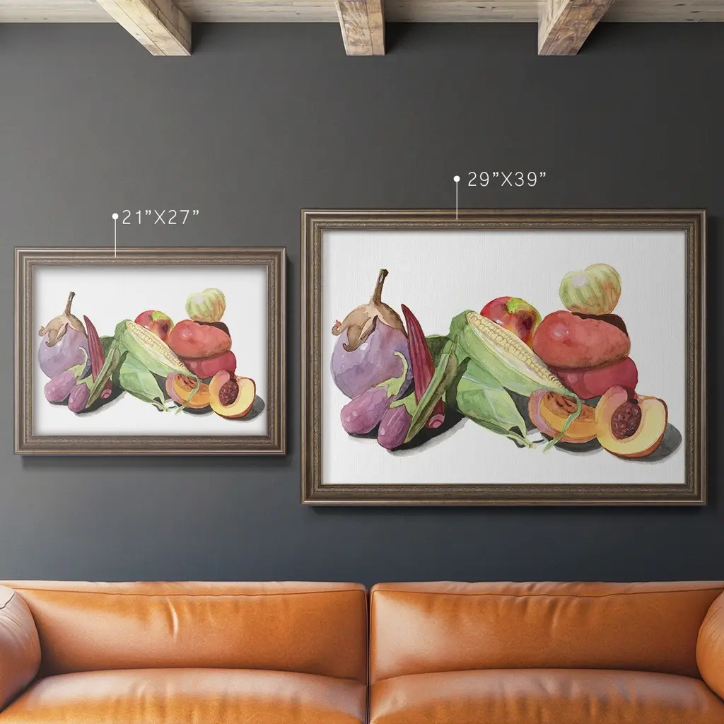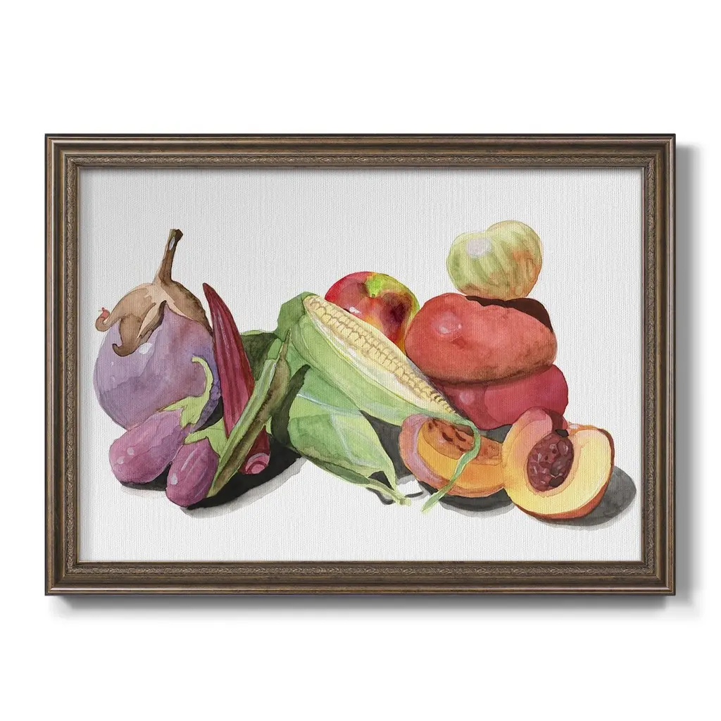 Farmer's Market I Premium Framed Canvas- Ready to Hang A Premium Framed Canvas created to last. Framed in distressed wood and available in an array of sizes and colors Featuring a beveled a solid wood stretcher bar, each piece comes ready to hand 3 SIZES AVAILABLE 16''X20'' - Overall Size 18'X27'' - Overall Size 24''x36'' - Overall Size Each piece is made to order. Each piece comes with hanging hardware. Made in the USA Ready to Hang Giclee Paper Print Acrylic Glass Beveled Matt Board