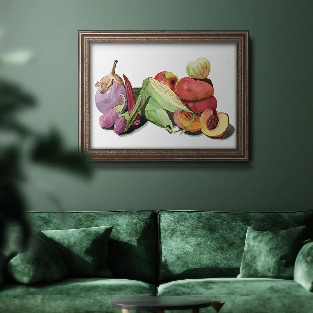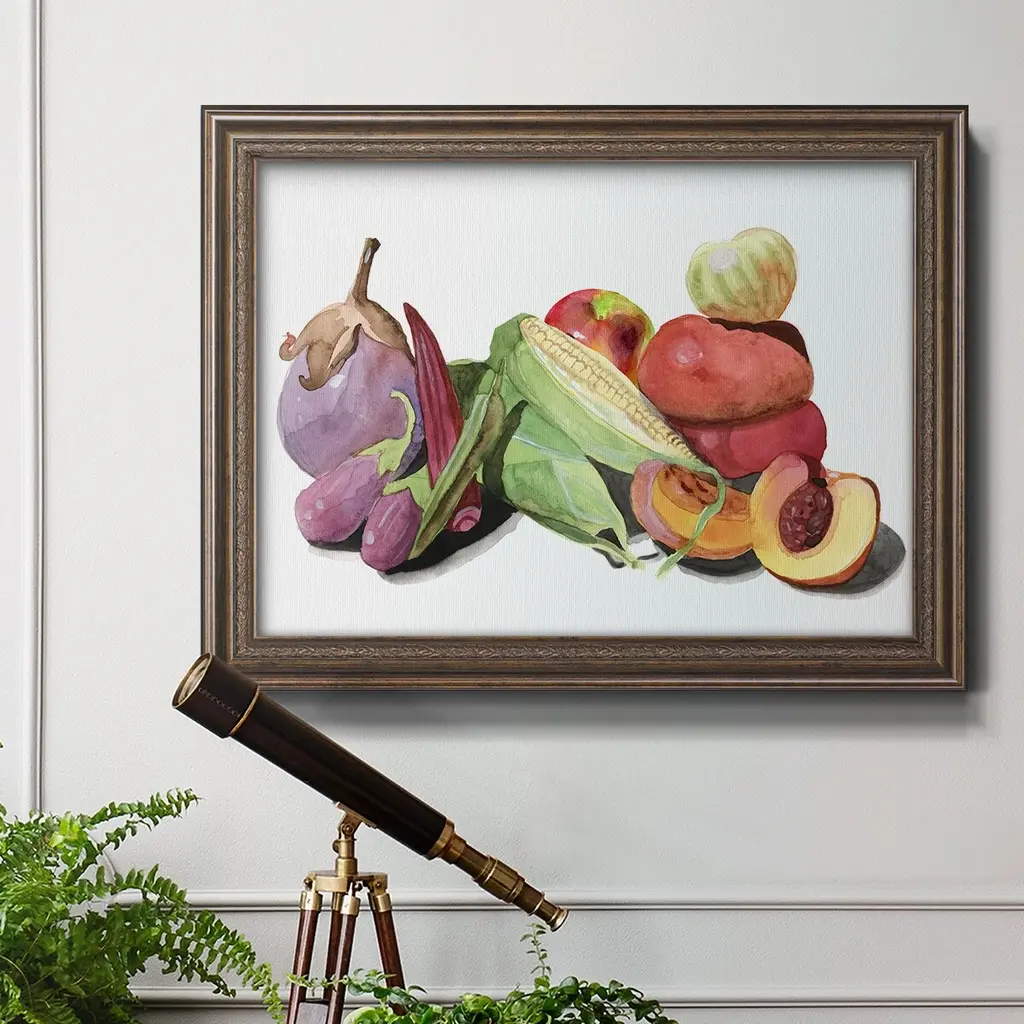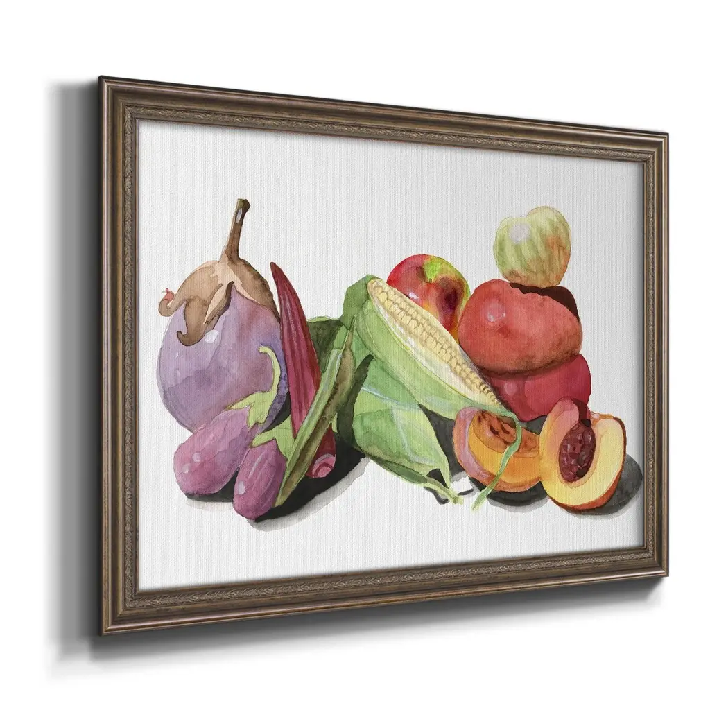 Farmer's Market I Premium Framed Canvas- Ready to Hang A Premium Framed Canvas created to last. Framed in distressed wood and available in an array of sizes and colors Featuring a beveled a solid wood stretcher bar, each piece comes ready to hand 3 SIZES AVAILABLE 16''X20'' - Overall Size 18'X27'' - Overall Size 24''x36'' - Overall Size Each piece is made to order. Each piece comes with hanging hardware. Made in the USA Ready to Hang Giclee Paper Print Acrylic Glass Beveled Matt Board