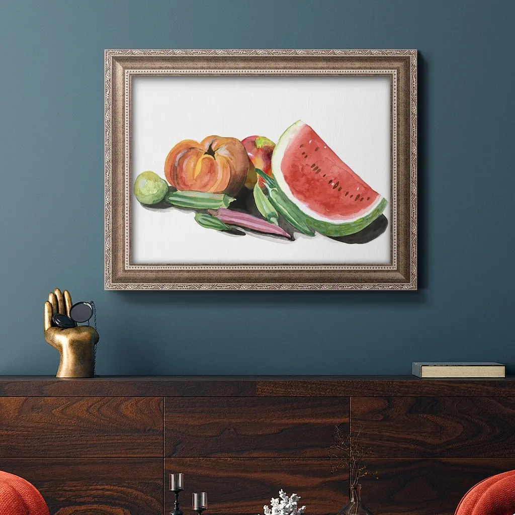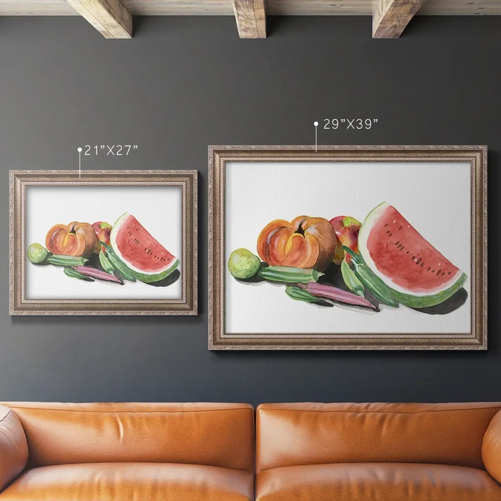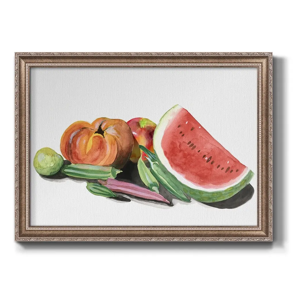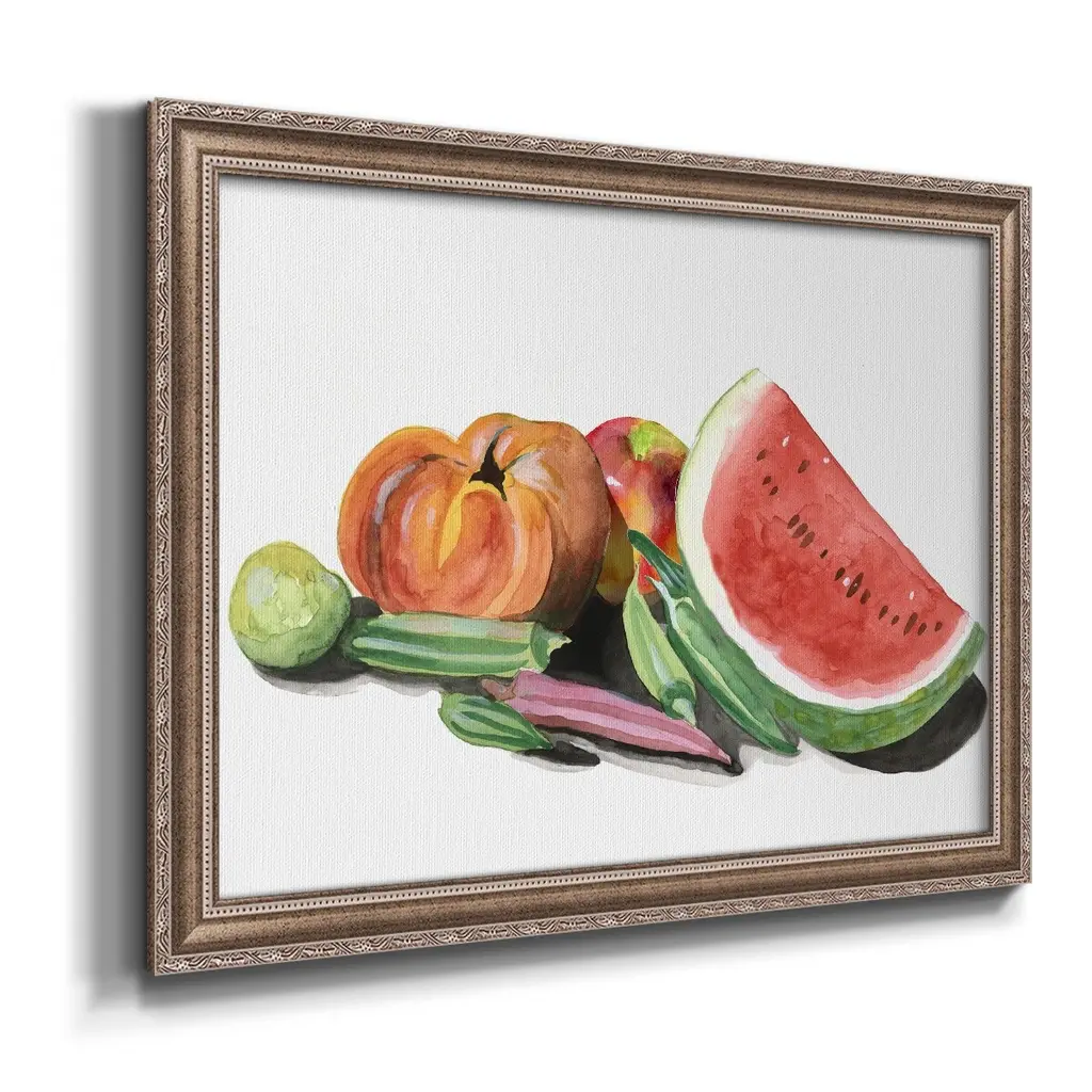 Farmer's Market II Premium Framed Canvas- Ready to Hang A Premium Framed Canvas created to last. Framed in distressed wood and available in an array of sizes and colors Featuring a beveled a solid wood stretcher bar, each piece comes ready to hand 3 SIZES AVAILABLE 16''X20'' - Overall Size 18'X27'' - Overall Size 24''x36'' - Overall Size Each piece is made to order. Each piece comes with hanging hardware. Made in the USA Ready to Hang Giclee Paper Print Acrylic Glass Beveled Matt Board