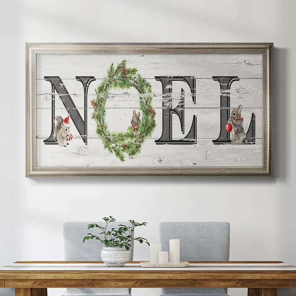 Farmhouse Noel Premium Framed Canvas- Ready to Hang A Premium Framed Canvas created to last. Framed in distressed wood and available in an array of sizes and colors Featuring a beveled a solid wood stretcher bar, each piece comes ready to hand 3 SIZES AVAILABLE 21''X37'' - Overall Size 25''X45'' - Overall Size 29''x53'' - Overall Size Each piece is made to order. Each piece comes with hanging hardware. Made in the USA Ready to Hang Giclee Paper Print Acrylic Glass Beveled Matt Board