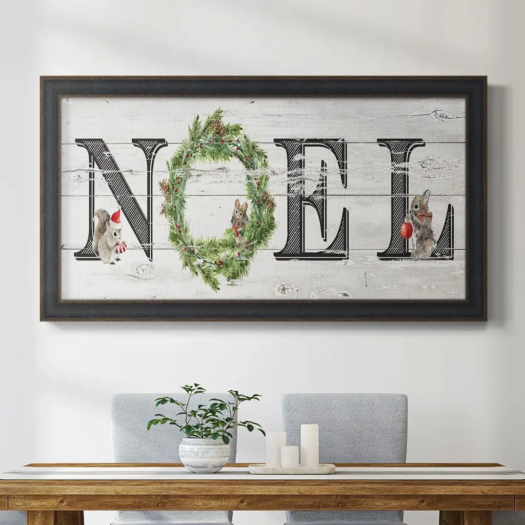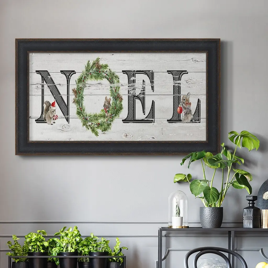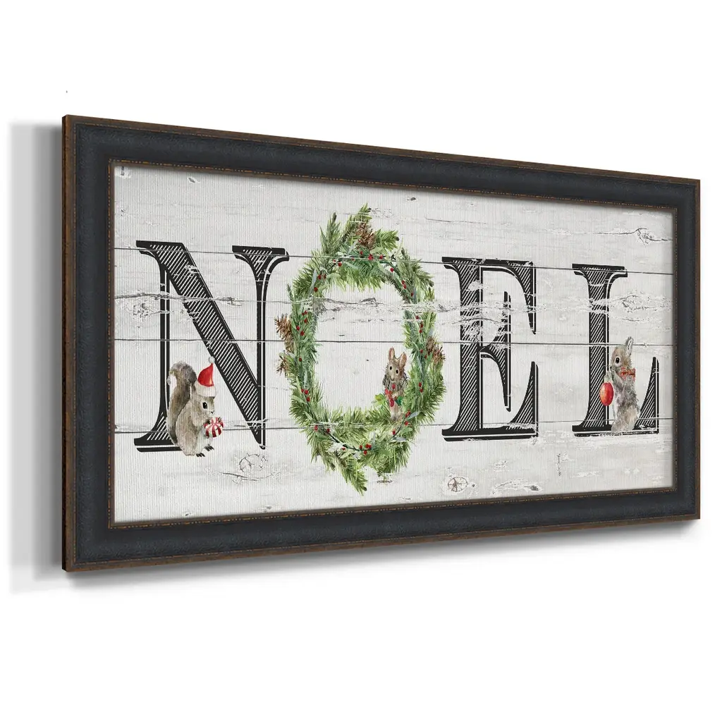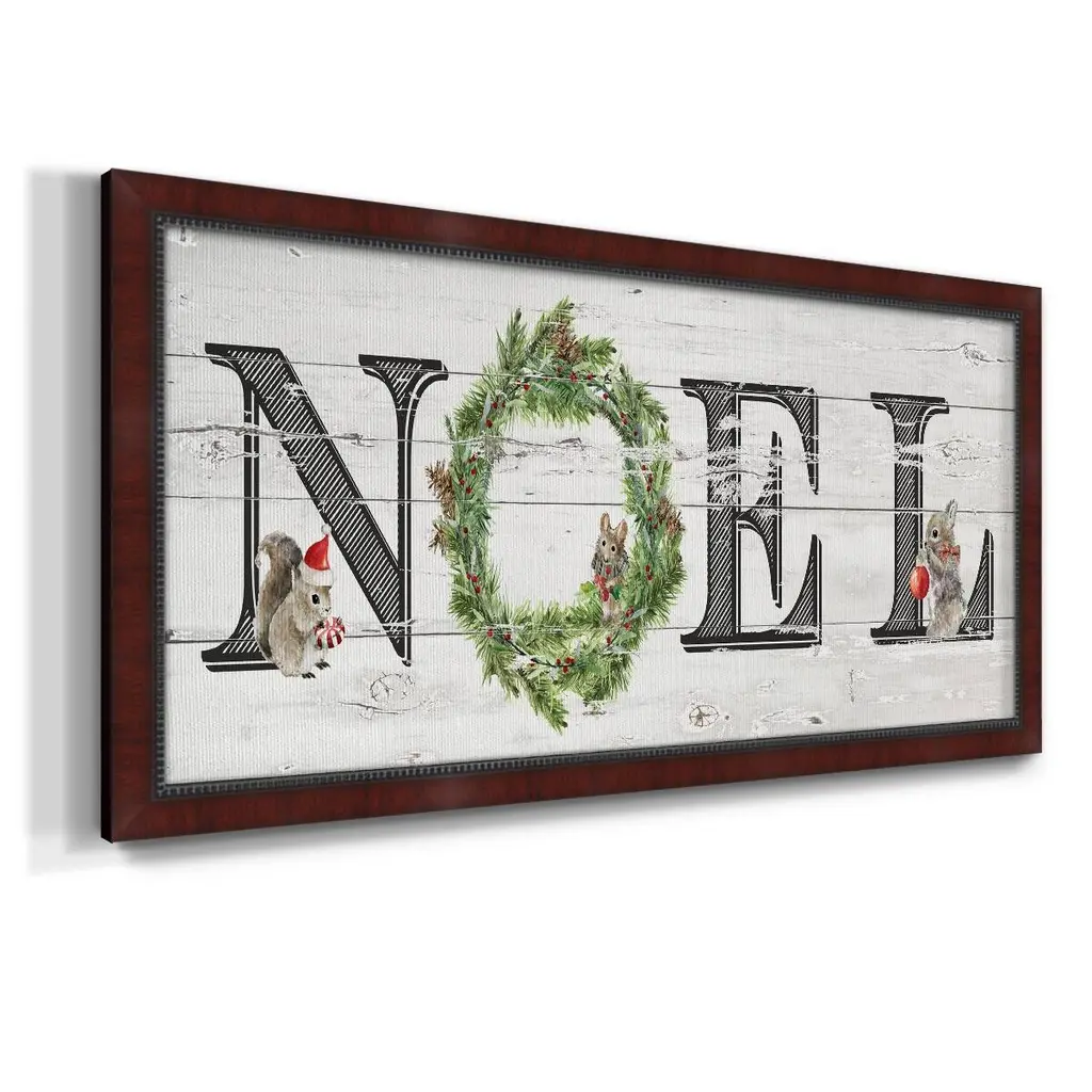 Farmhouse Noel Premium Framed Canvas- Ready to Hang A Premium Framed Canvas created to last. Framed in distressed wood and available in an array of sizes and colors Featuring a beveled a solid wood stretcher bar, each piece comes ready to hand 3 SIZES AVAILABLE 21''X37'' - Overall Size 25''X45'' - Overall Size 29''x53'' - Overall Size Each piece is made to order. Each piece comes with hanging hardware. Made in the USA Ready to Hang Giclee Paper Print Acrylic Glass Beveled Matt Board