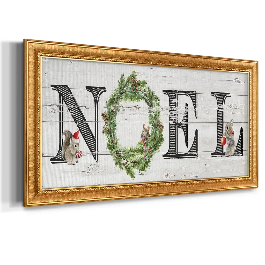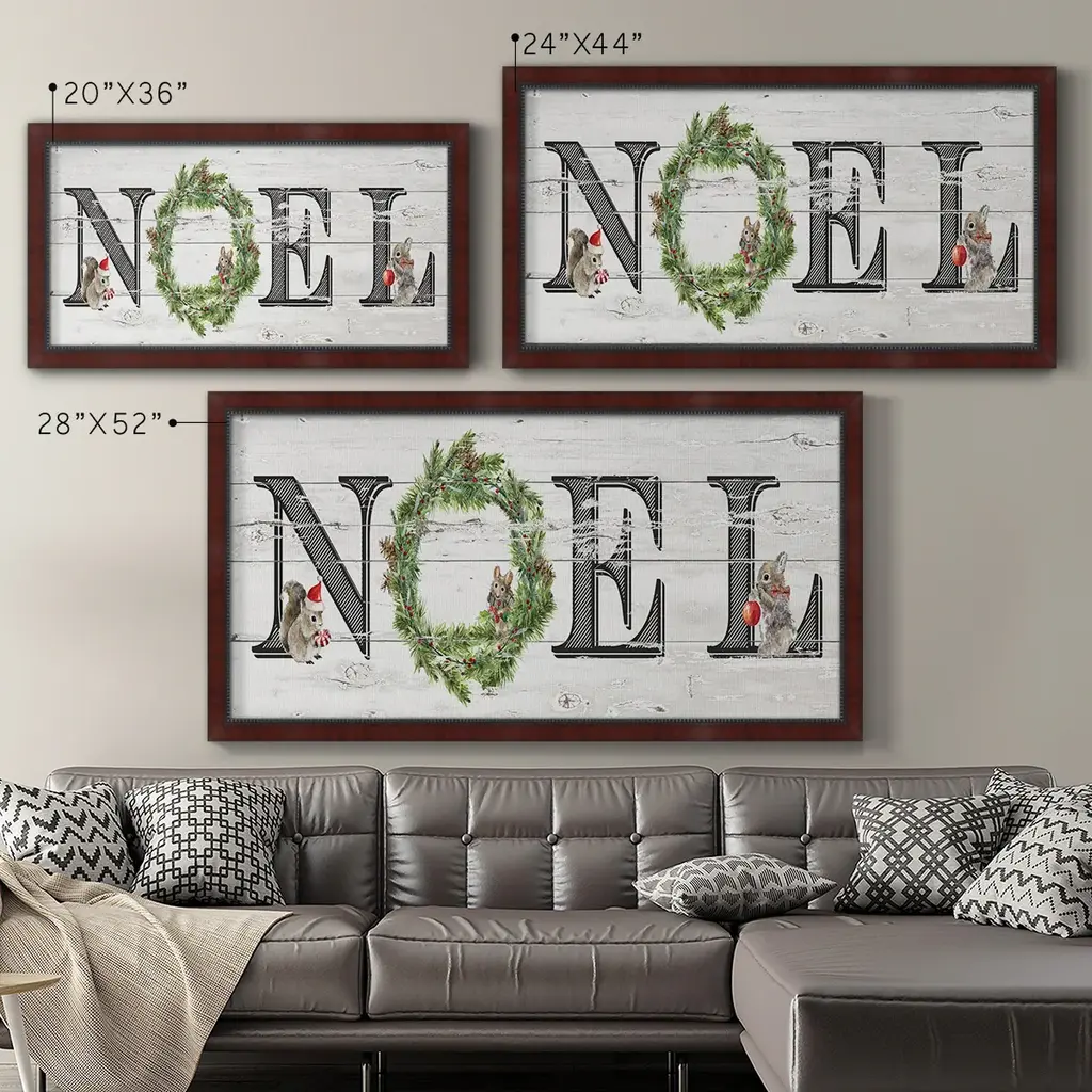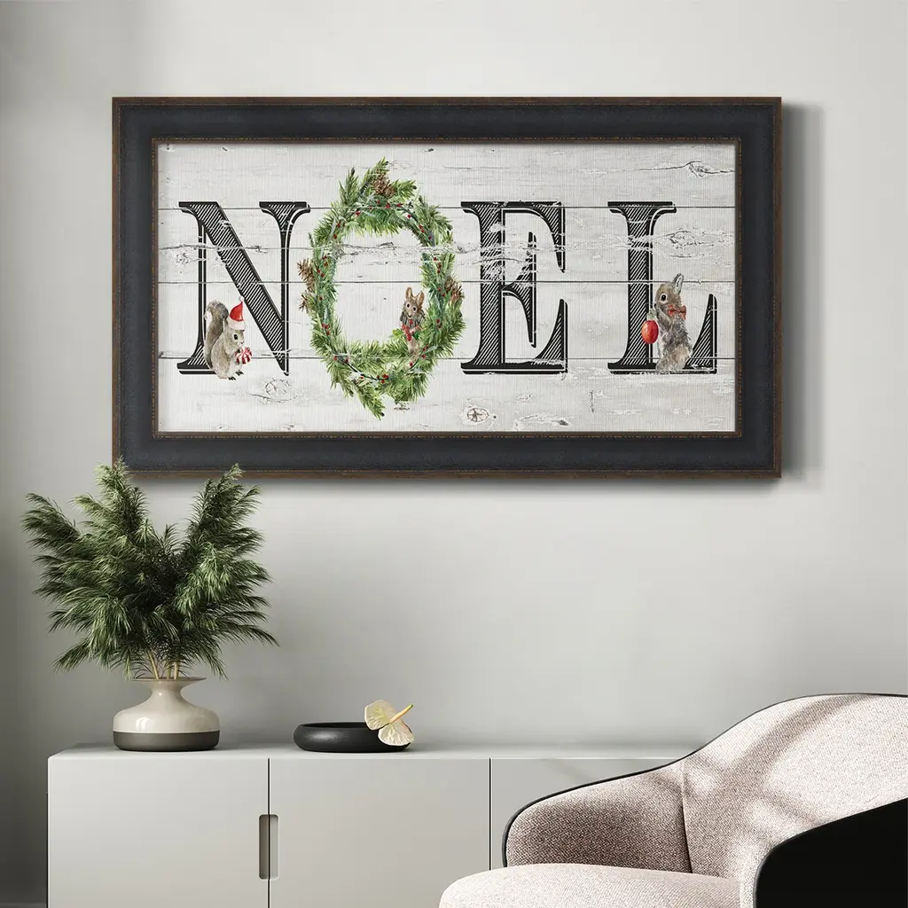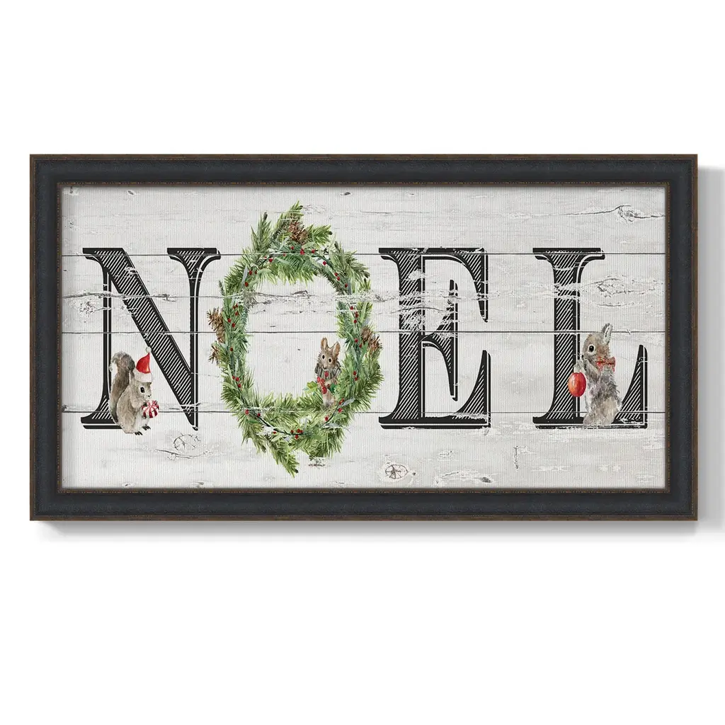 Farmhouse Noel Premium Framed Canvas- Ready to Hang A Premium Framed Canvas created to last. Framed in distressed wood and available in an array of sizes and colors Featuring a beveled a solid wood stretcher bar, each piece comes ready to hand 3 SIZES AVAILABLE 21''X37'' - Overall Size 25''X45'' - Overall Size 29''x53'' - Overall Size Each piece is made to order. Each piece comes with hanging hardware. Made in the USA Ready to Hang Giclee Paper Print Acrylic Glass Beveled Matt Board