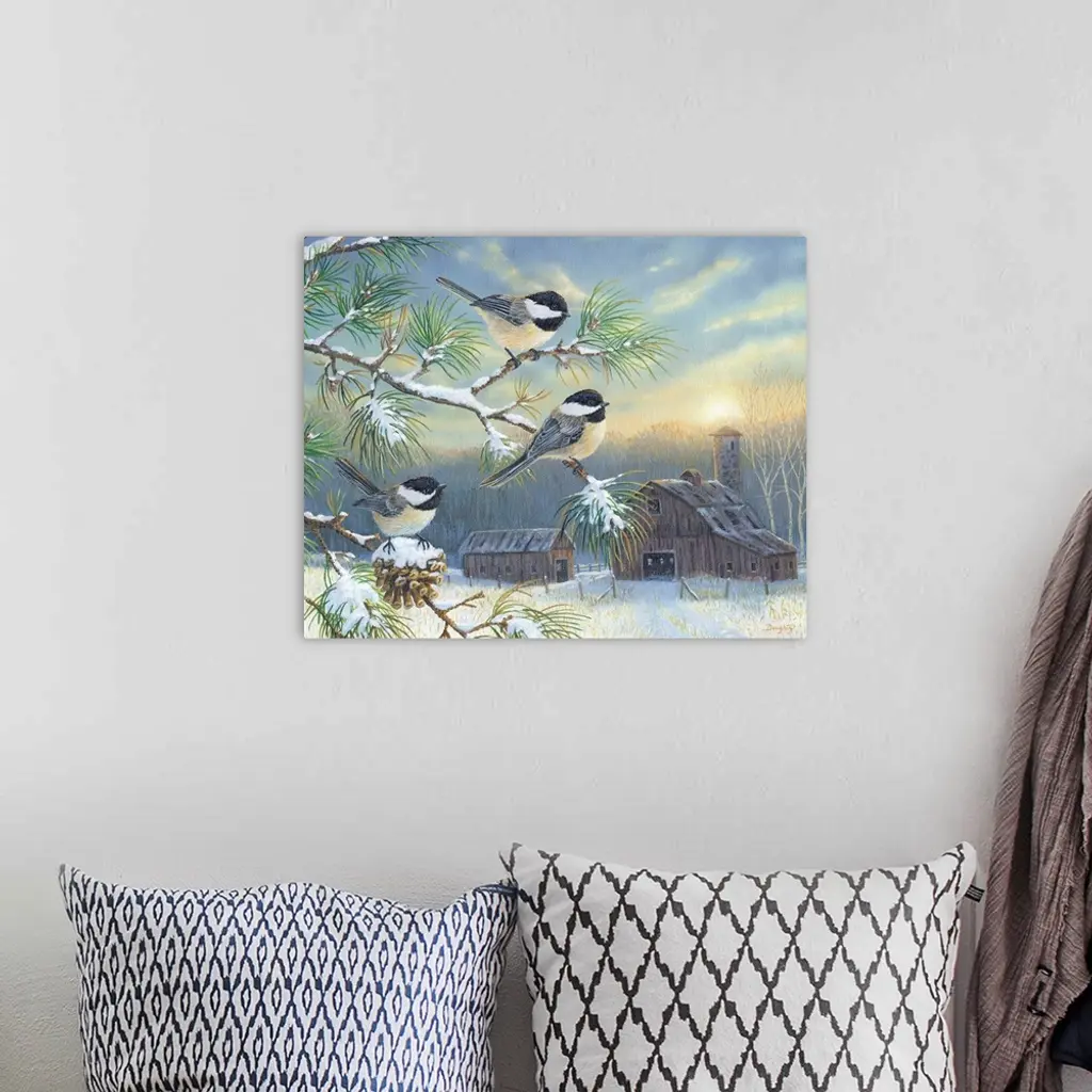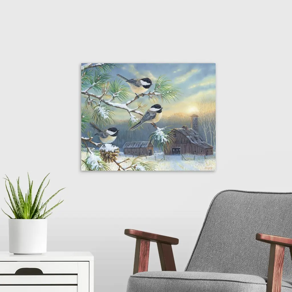 Contemporary artwork of three chickadees in a tree, overlooking a barn.