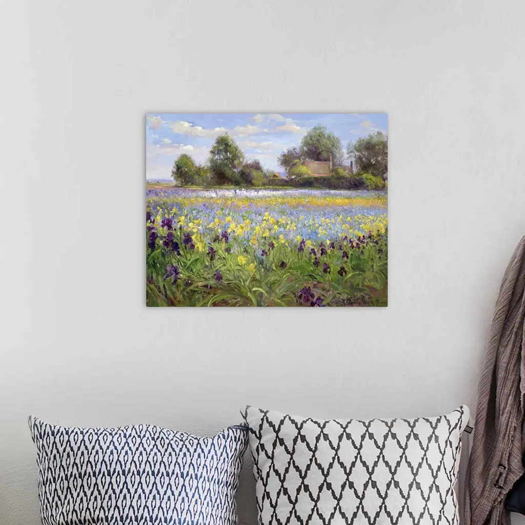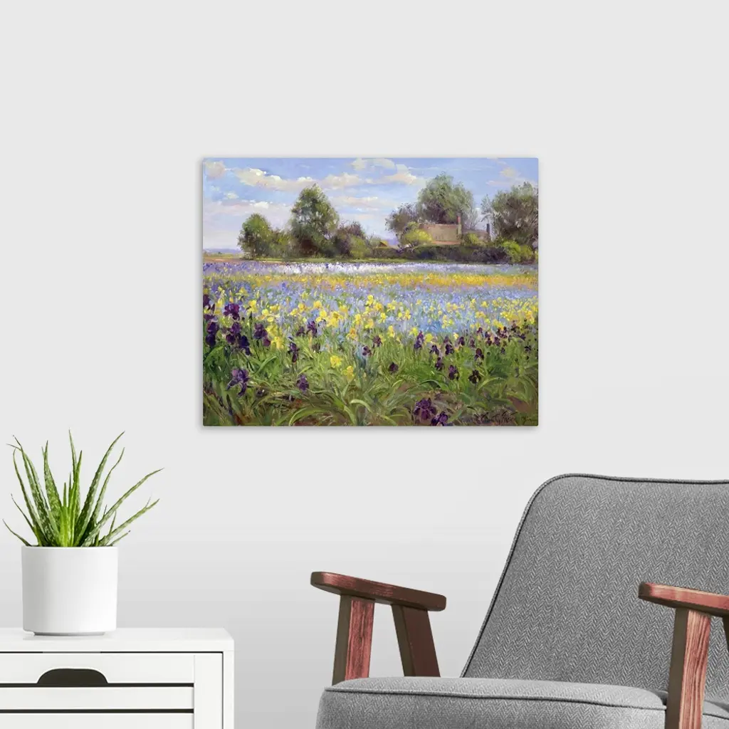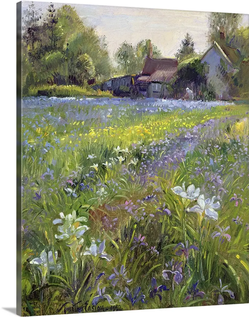 Painting on canvas of a field of wildflowers with a house and trees in the distance.