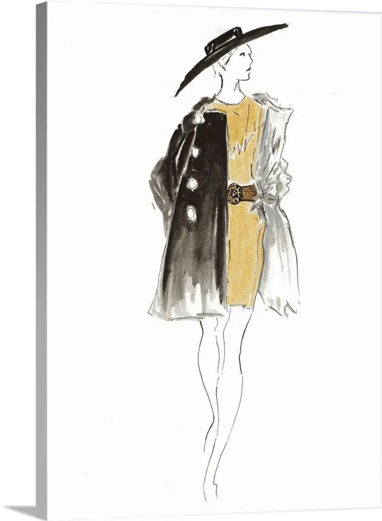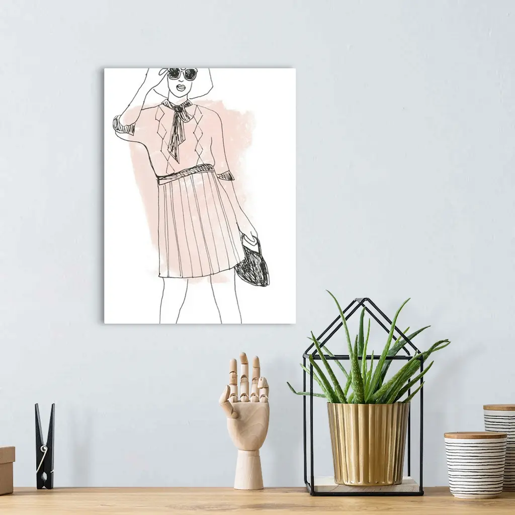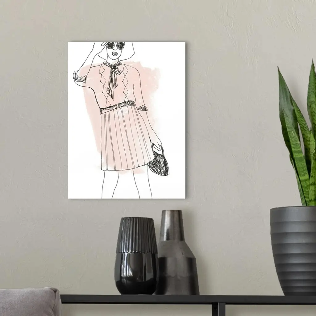 Black and white fashion sketch on a white background with blush pink brushstrokes.