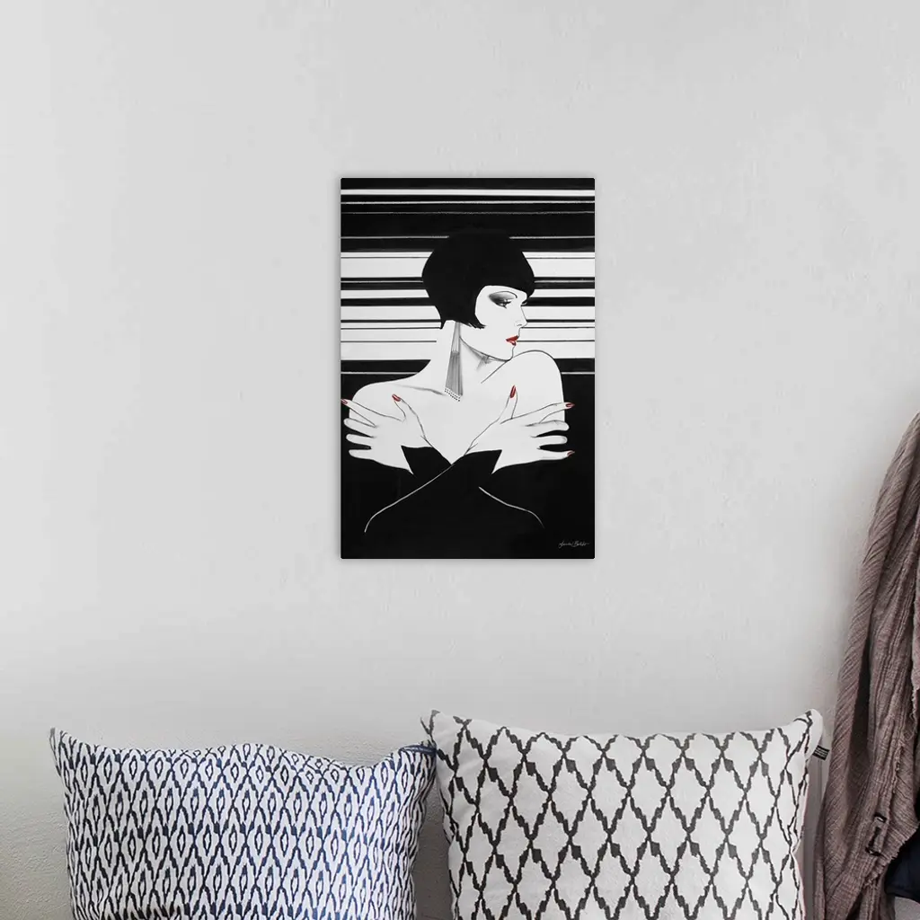 Fashion artwork of a woman with a black bob haircut and wearing a black strapless dress.