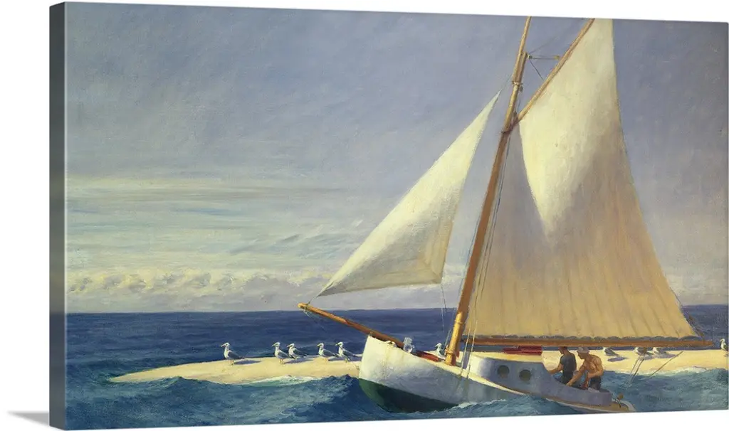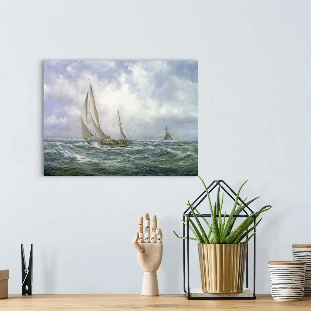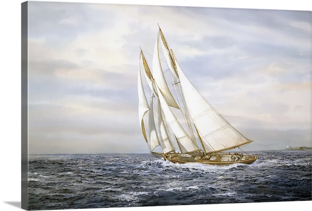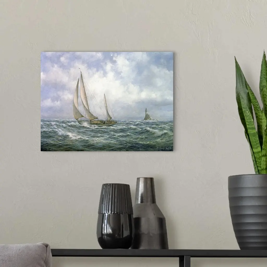 A large artwork piece of a sailboat in rough waters with a cloudy sky behind it and a lighthouse in the distance.