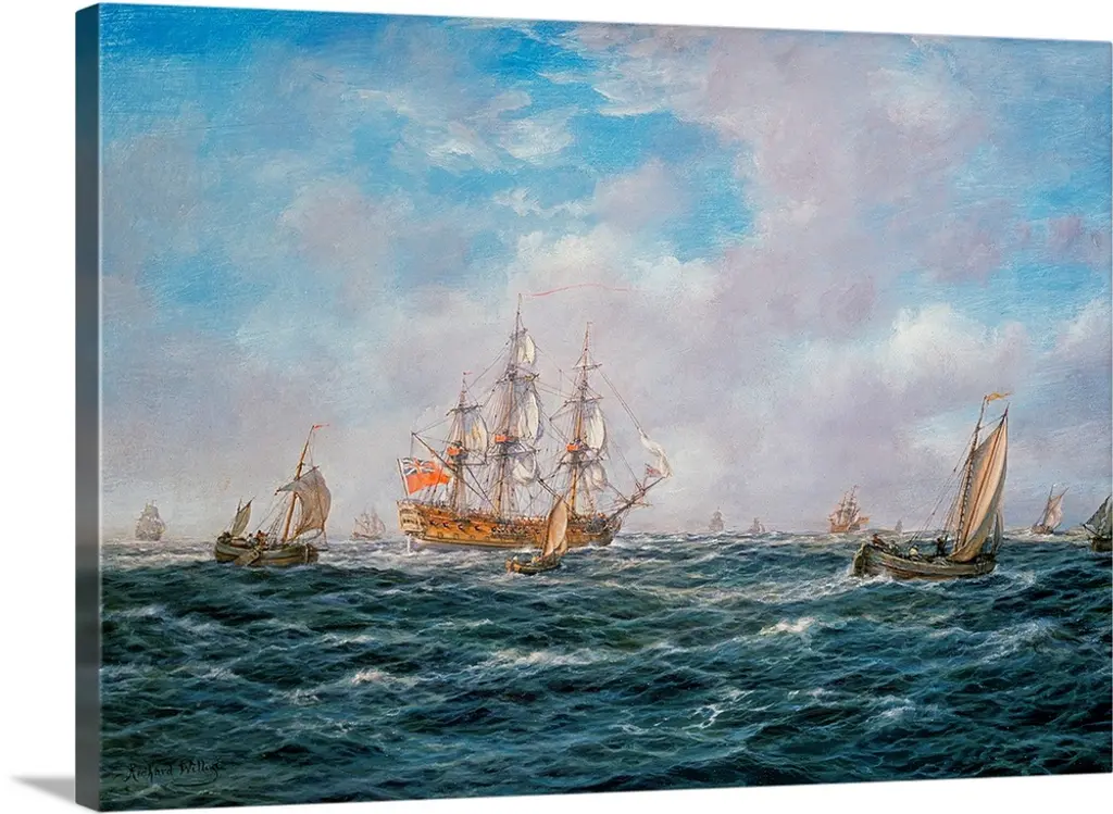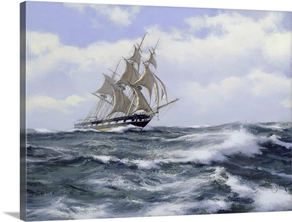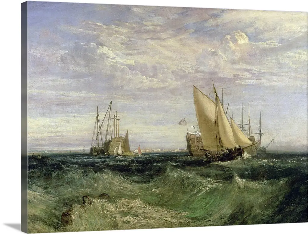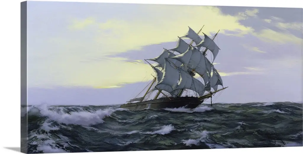 A large artwork piece of a sailboat in rough waters with a cloudy sky behind it and a lighthouse in the distance.