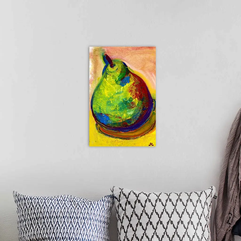 A piece of contemporary artwork of a drawn pear that uses various colors for shading and shadowing.