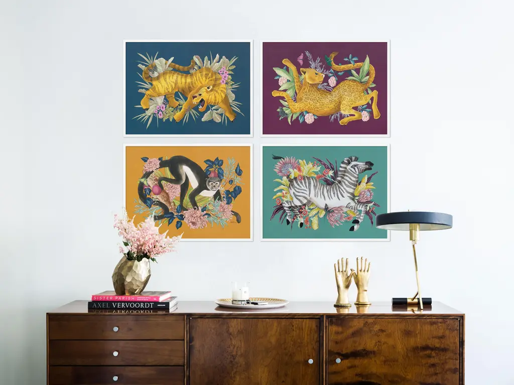 DESCRIPTION: Fauna Set of 4 by Allison Cosmos in White Frame, Medium Art Print SPECIFICATIONS: Type: Framed Paper. Individual Frame Size (in): 36x27. Orientation: Horizontal. Flush/Float/Matted: Flush. Frame Color: White. Hanging Hardware: Picture Perfect. 4 pieces are included with this purchase. Overall set dimensions as pictured: 72x54. FRAMING: Each art work arrives framed and ready to hang. We use handmade frames with a plexiglass glazing front, because it offers less glare than standard glass. At this time, we only offer framed prints. ARTIST BIO: Allison Cosmos has built a 24 year reputation of innovative design, superb craftsmanship and excellent customer service. She holds a Bachelor of Fine Arts degree from the Ringling College of Art and Design in Sarasota, Florida. She has gained recognition in various national publications such as Elle Decor, House Beautiful, Veranda, Metropolitan Home, HGTV and Houzz. Her work has been featured at a variety of philanthropic events such as Design on a Dime (Housing Works), Women of Style and Substance (Children’s Healthcare of Atlanta) and Friends of Greystone Mansion. She has been commissioned to do a variety of styles and projects from some of the most talented designers in the country. Allison has worked in Los Angeles, Portland, Las Vegas, San Francisco, Sarasota, Greensboro and Chicago. Allison presently lives in Southern, CA with her husband of 13 years, her 2 young daughters and her Chocolate Lab, Kona and Brittany Spaniel, Ollie.