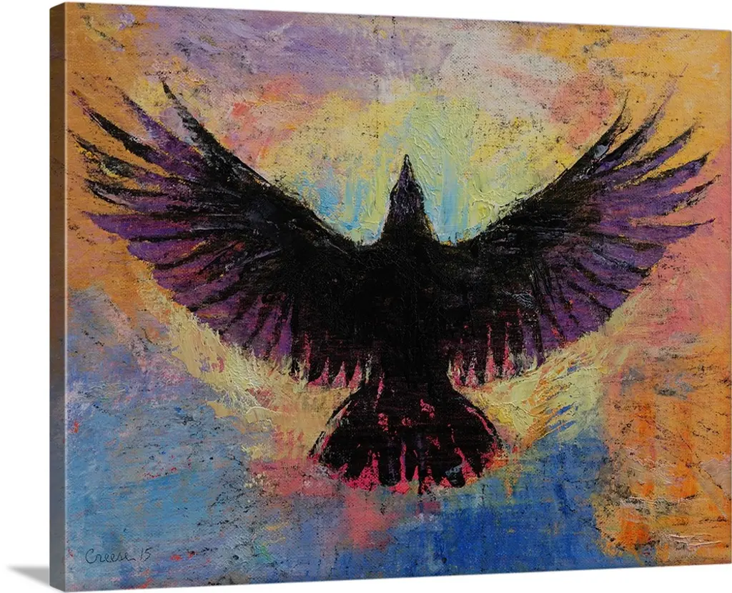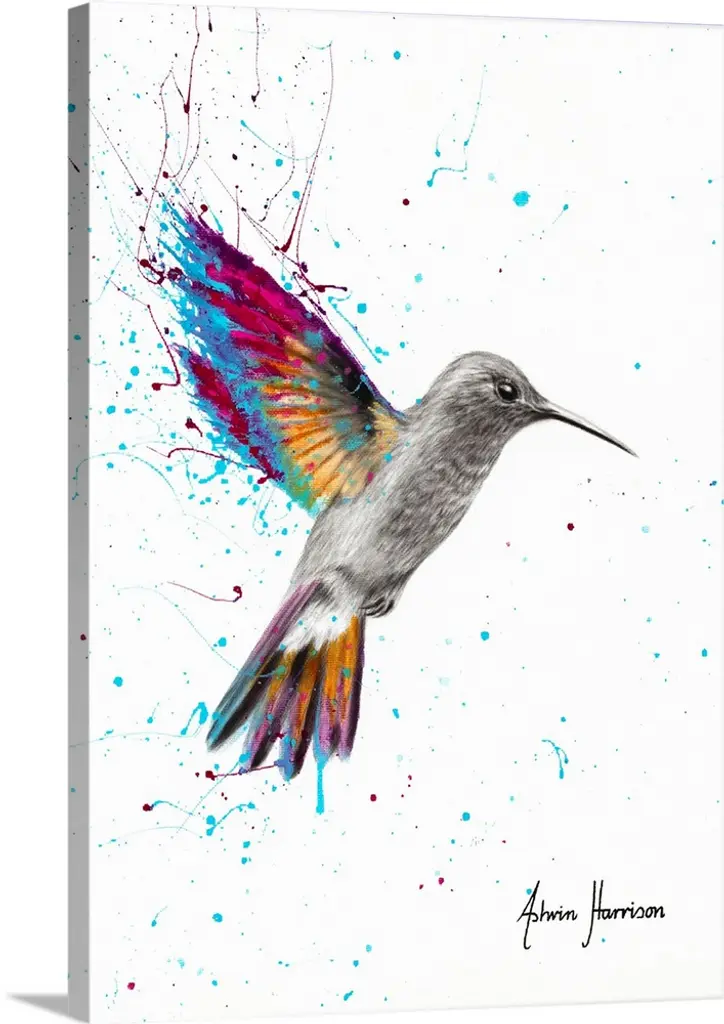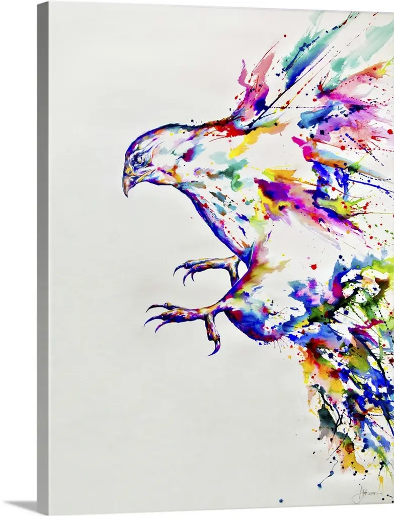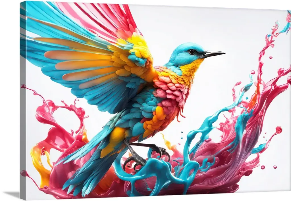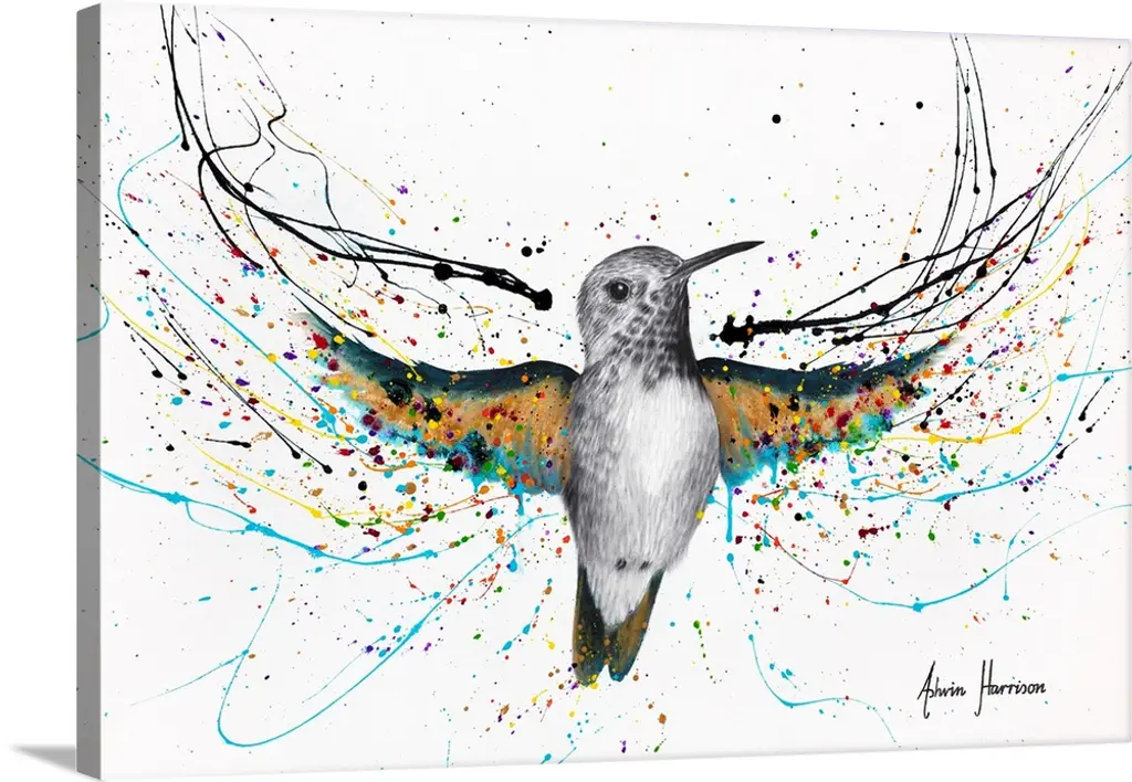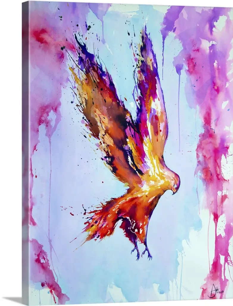 Watercolor and ink painting of a colorful bird in flight in the sky.