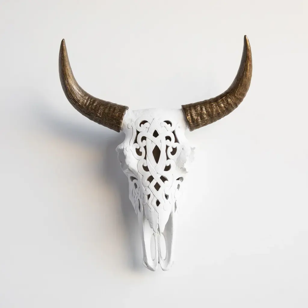 Faux Cow Skull Decorative Carved Bison Skull Wall Decor, White And Bronze
