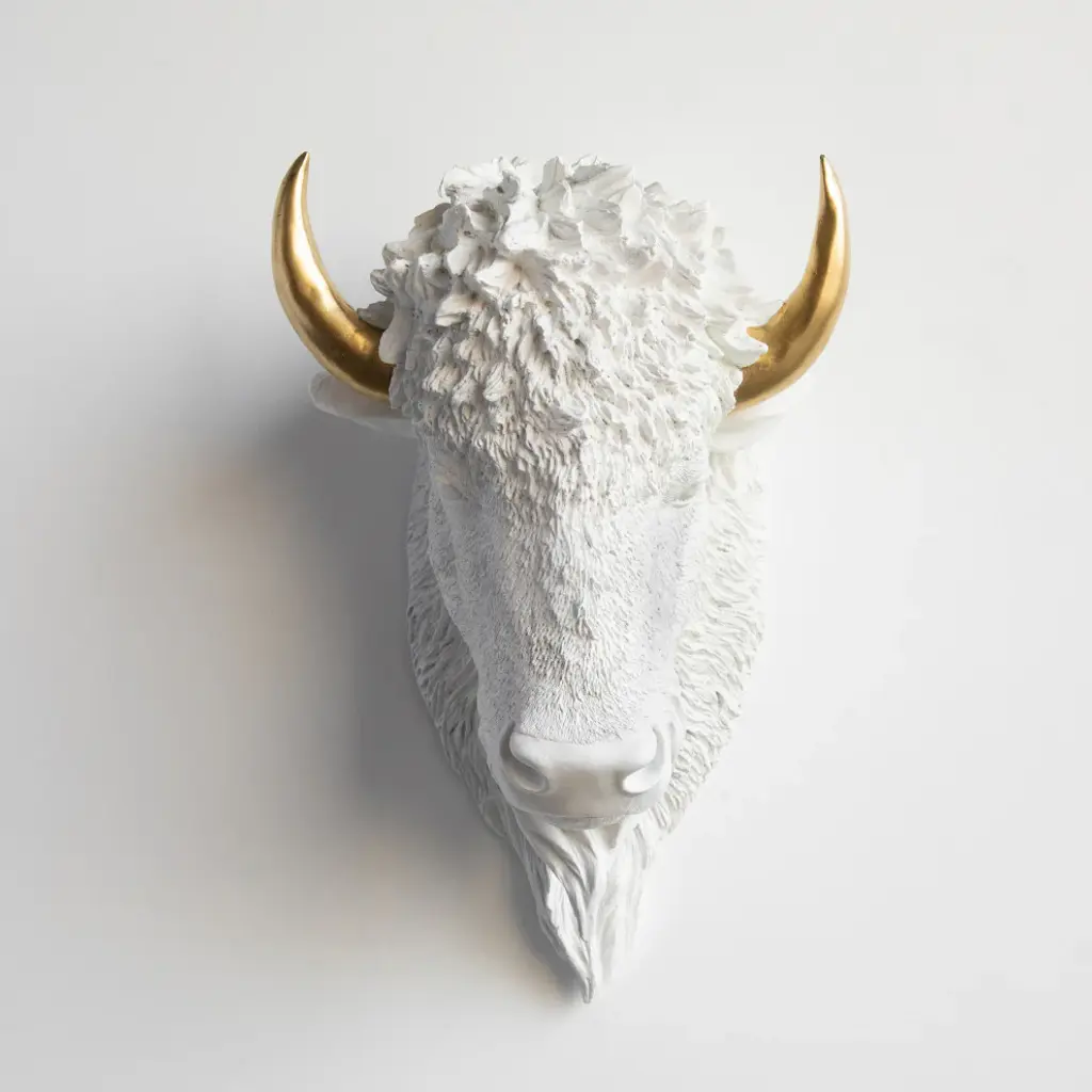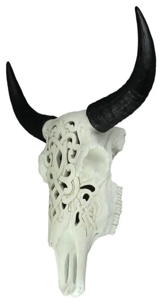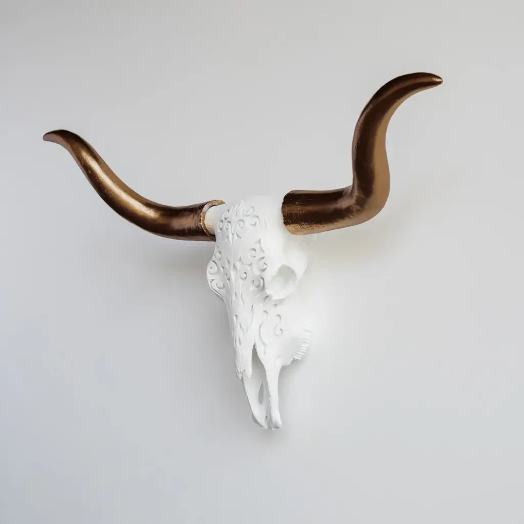 Faux Large Carved Texas Longhorn Skull Wall Decor, White And Bronze