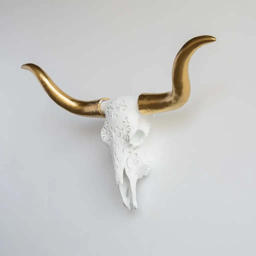 Faux Large Carved Texas Longhorn Skull Wall Decor, White And Gold