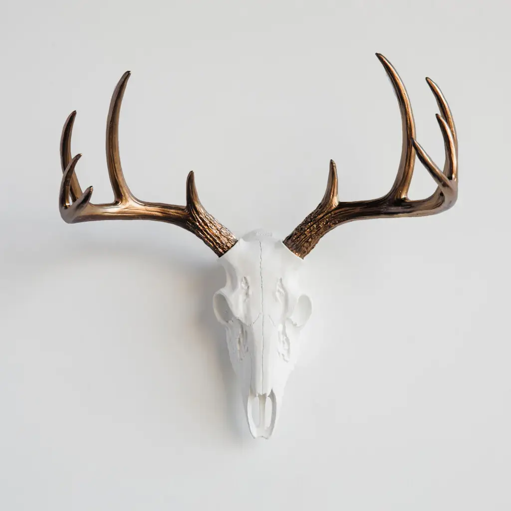 Faux White Mini Deer Skull With Natural Antlers Wall Decor, Bronze, White