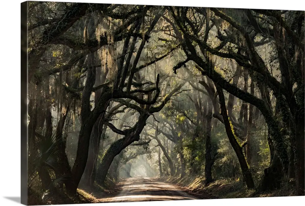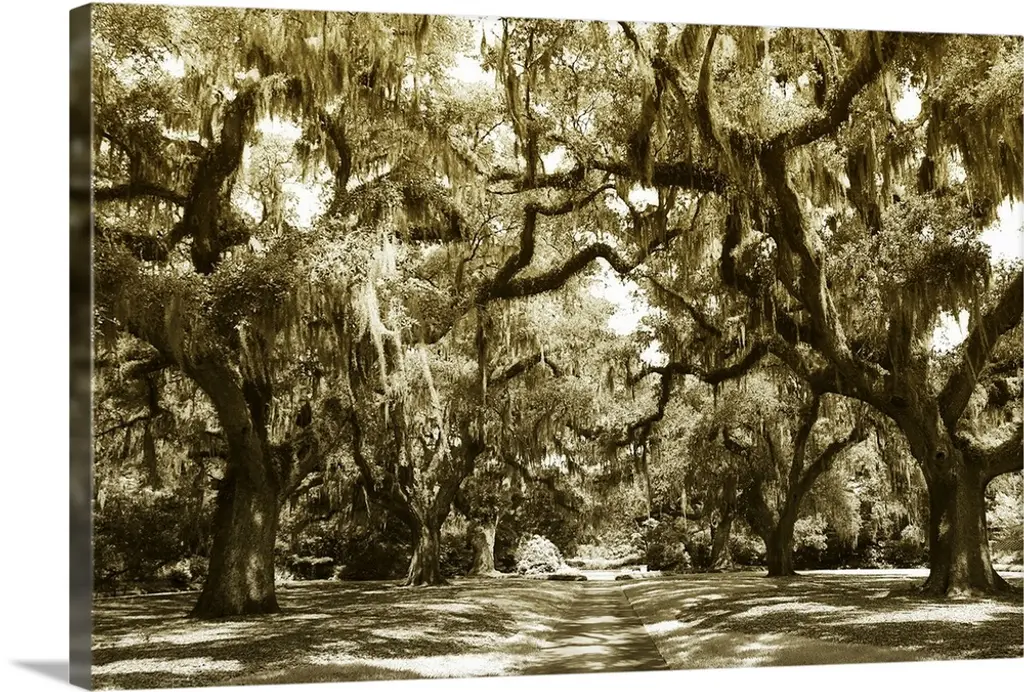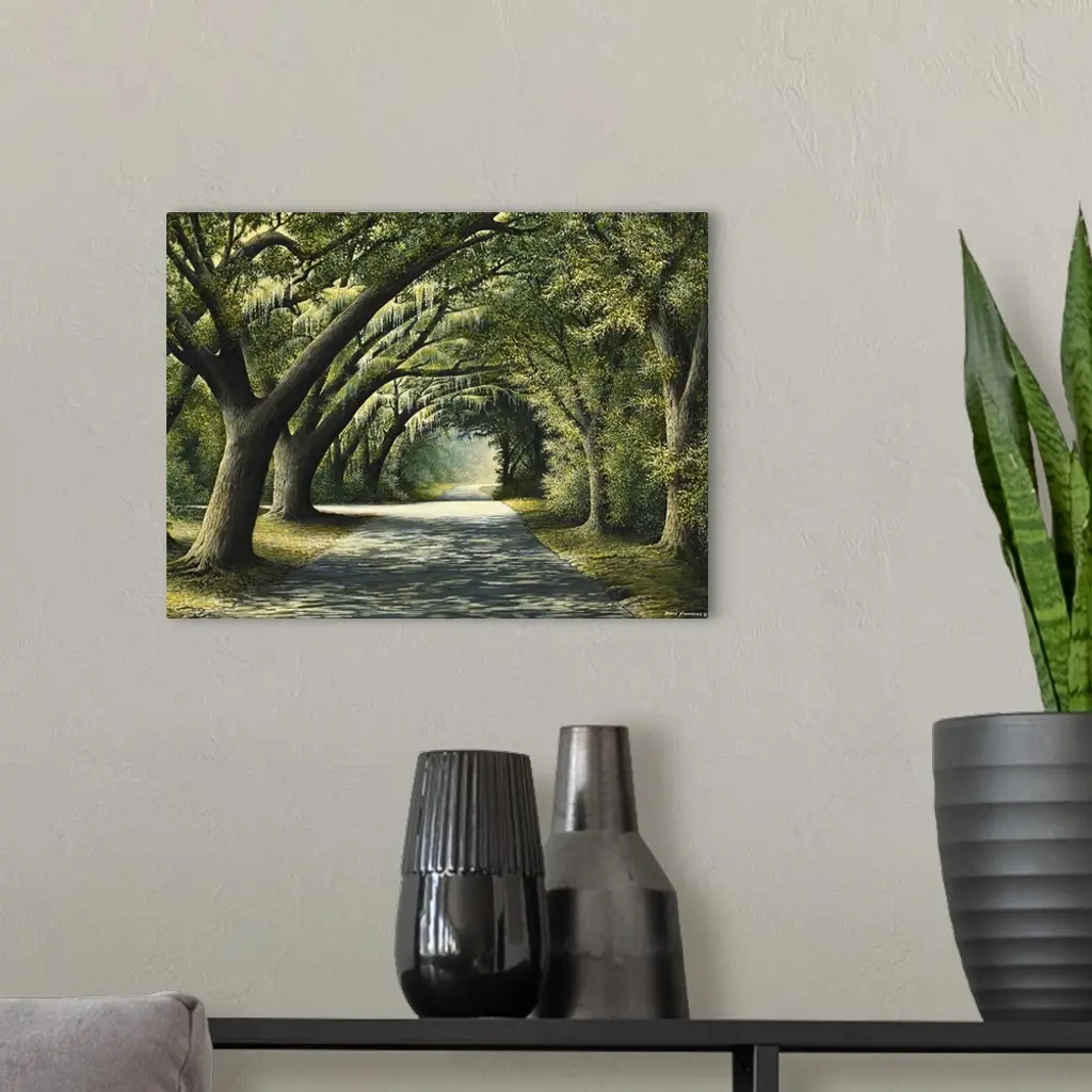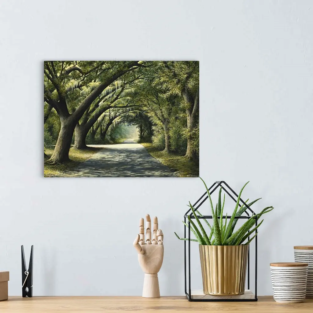 Painting of a shady path through a grove of trees.