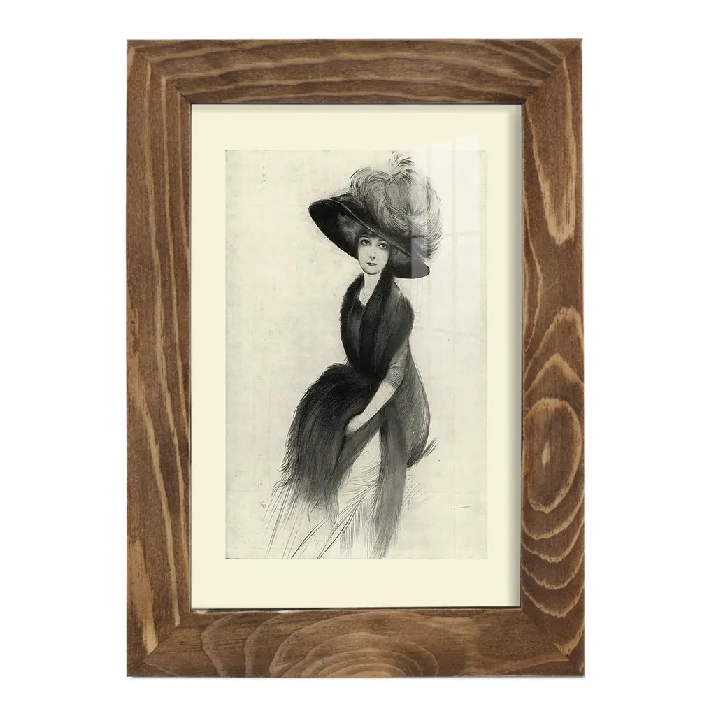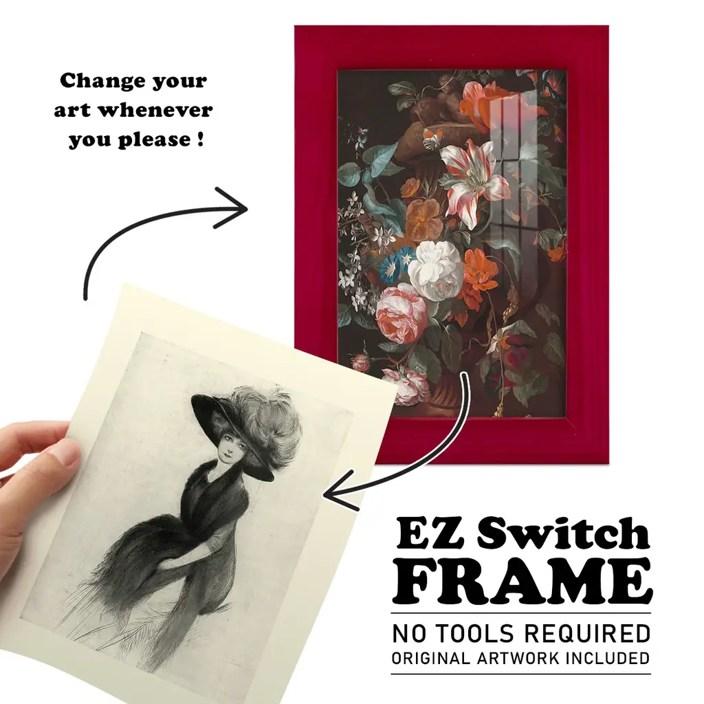 Feather Hat II -EZ SWITCH Framed Print w/glass-Cherry Red A delightful, framed print. Featuring a solid wood frame with real wood glass. This premium print is giclee quality. In addition, every frame features a removable back and table top stand. This allows you to change your art in the future or to just stand the art on a table for a new look. We are sure you'll enjoy our new series of EZ SWITCH Framed Art. Solid Wood Frame Real Glass Removable / Replaceable Art Built in Tabletop Stand Sizes range from 4x6 up to 12x15 - buy just one or pair them up as sets as you see fit.