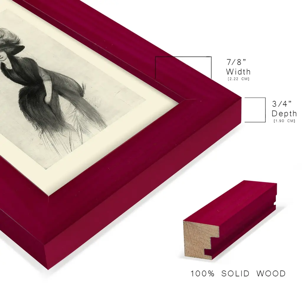 Feather Hat II -EZ SWITCH Framed Print w/glass-Cherry Red A delightful, framed print. Featuring a solid wood frame with real wood glass. This premium print is giclee quality. In addition, every frame features a removable back and table top stand. This allows you to change your art in the future or to just stand the art on a table for a new look. We are sure you'll enjoy our new series of EZ SWITCH Framed Art. Solid Wood Frame Real Glass Removable / Replaceable Art Built in Tabletop Stand Sizes range from 4x6 up to 12x15 - buy just one or pair them up as sets as you see fit.