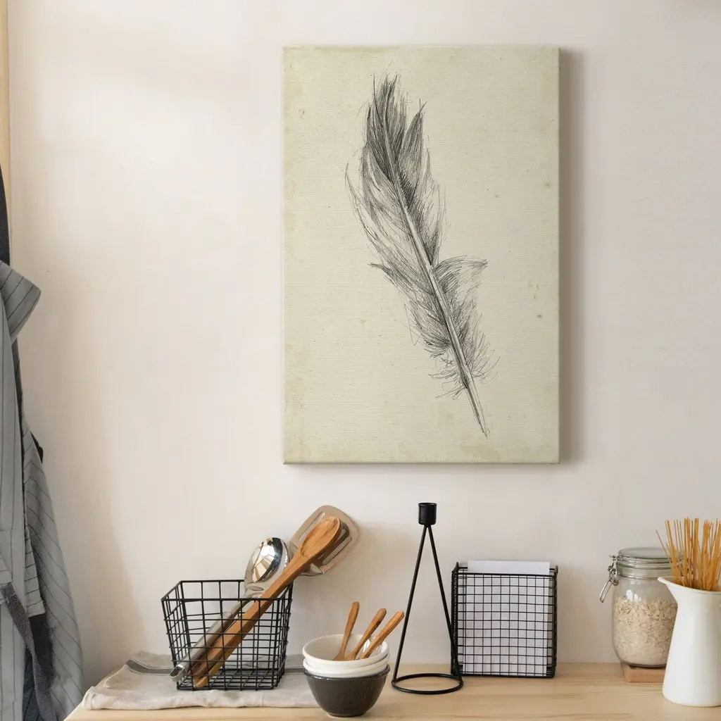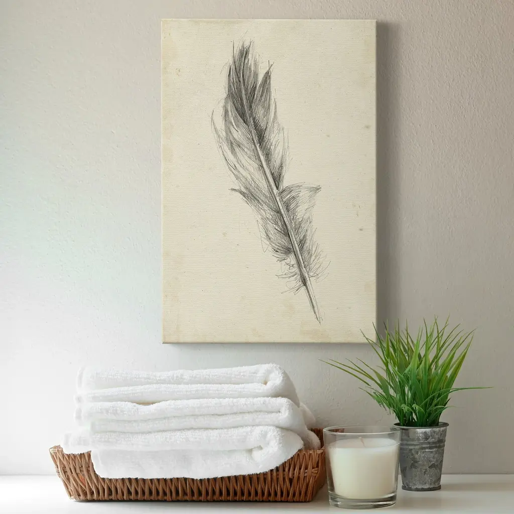 Feather Sketch IV Premium Gallery Wrapped Canvas - Ready to Hang A premium hand stretched gallery wrapped canvas print created to last. Featuring a beveled a solid wood stretcher bar, each piece comes ready to hand 5 SIZES AVAILABLE 8''X12'' - Overall Size 16'X20'' - Overall Size 24''x32'' - Overall Size 30''x40'' - Overall Size 36''x48'' - Overall Size Each piece is made to order. Built to Last Each piece comes ready to hang Solid wood stretcher Fade and Water resistant Made domestically