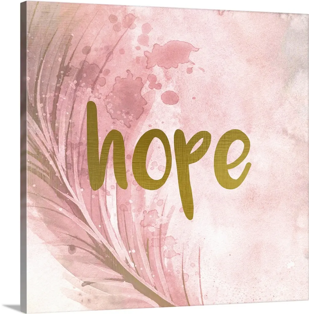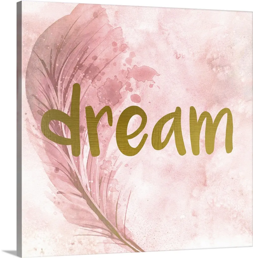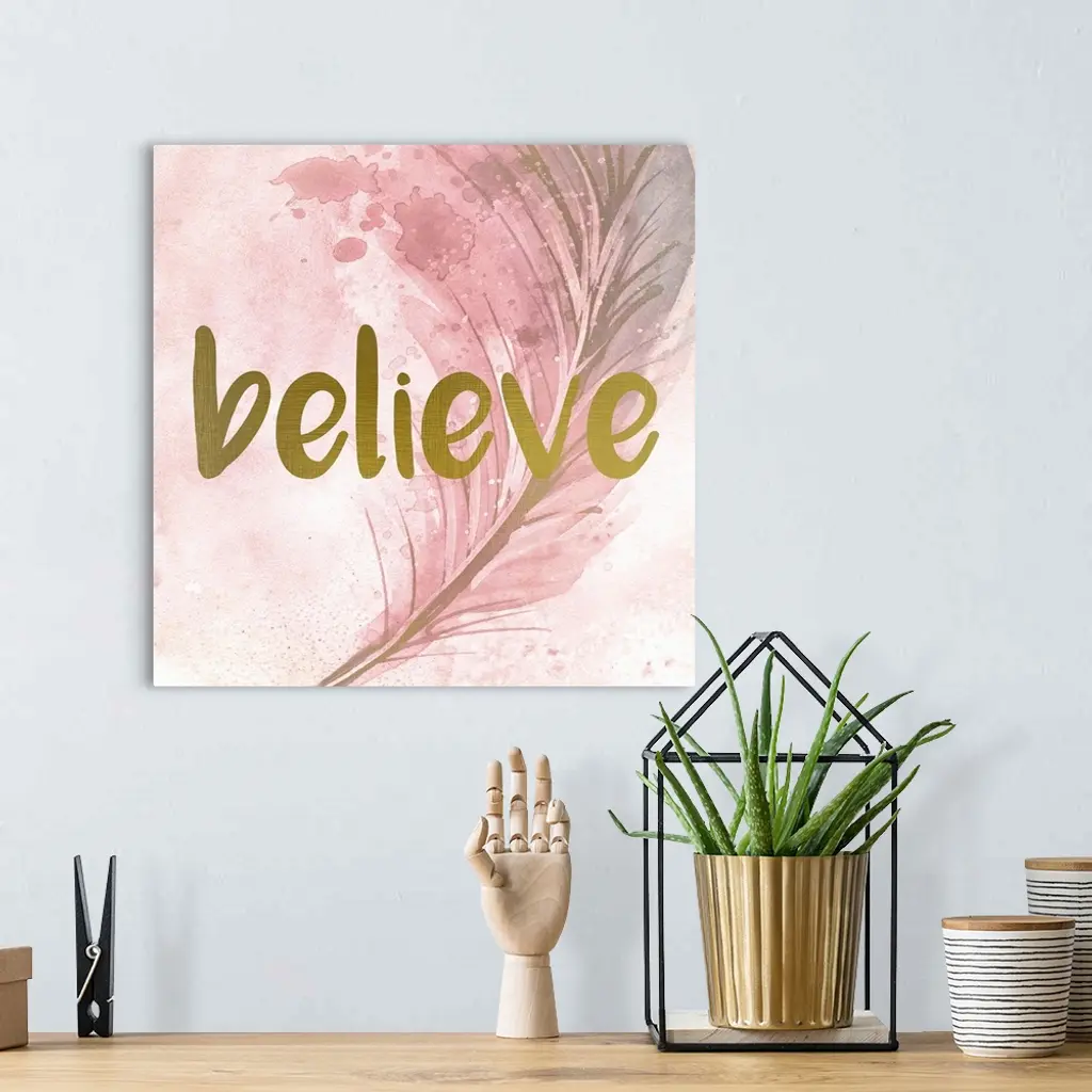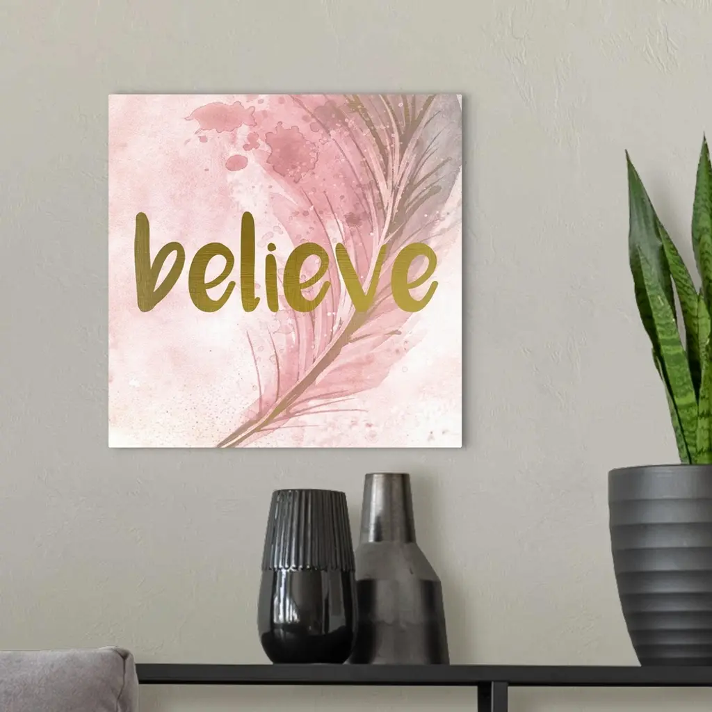 A pink watercolor painting of a feather with the word ?believe? placed on top in gold text.�