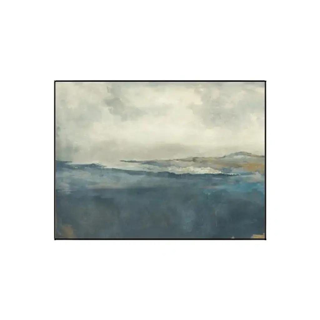 An ominous sky with textured clouds frame the landscape of this abstract landscape piece. With both warm and cool tones, this painting brings out the best palette in your home design.