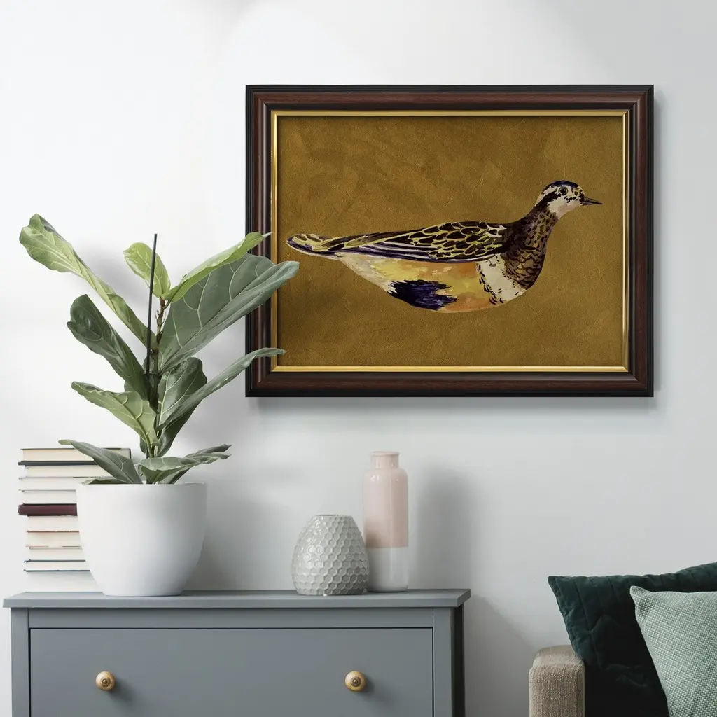 Feathered Friend II Premium Framed Canvas- Ready to Hang A Premium Framed Canvas created to last. Framed in distressed wood and available in an array of sizes and colors Featuring a beveled a solid wood stretcher bar, each piece comes ready to hand 3 SIZES AVAILABLE 16''X20'' - Overall Size 18'X27'' - Overall Size 24''x36'' - Overall Size Each piece is made to order. Each piece comes with hanging hardware. Made in the USA Ready to Hang Giclee Paper Print Acrylic Glass Beveled Matt Board