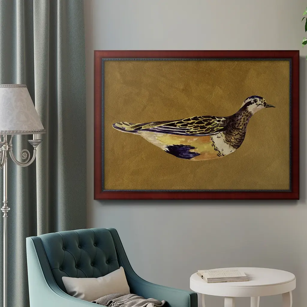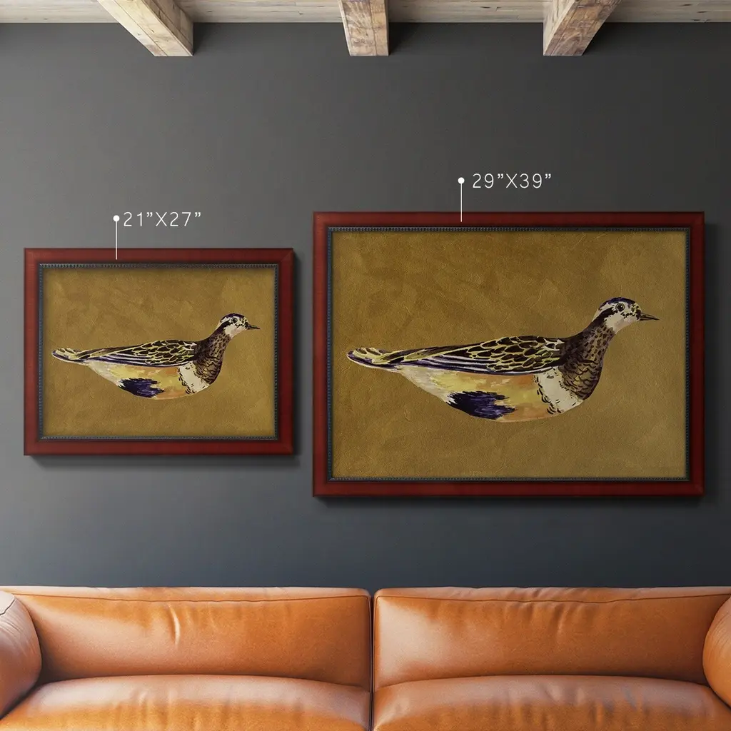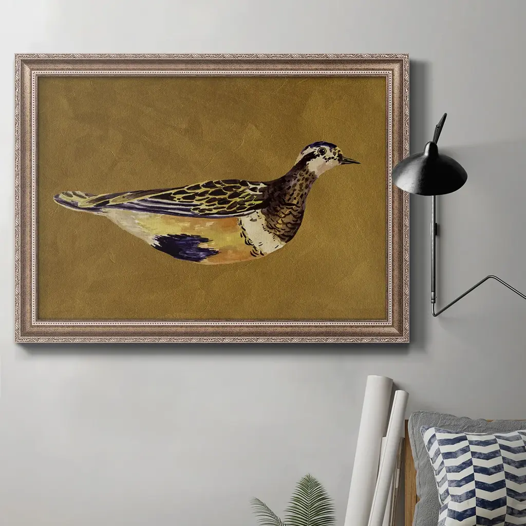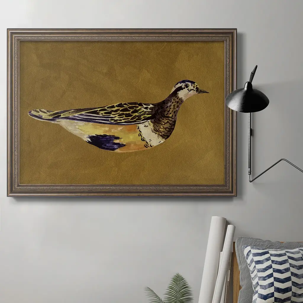 Feathered Friend II Premium Framed Canvas- Ready to Hang A Premium Framed Canvas created to last. Framed in distressed wood and available in an array of sizes and colors Featuring a beveled a solid wood stretcher bar, each piece comes ready to hand 3 SIZES AVAILABLE 16''X20'' - Overall Size 18'X27'' - Overall Size 24''x36'' - Overall Size Each piece is made to order. Each piece comes with hanging hardware. Made in the USA Ready to Hang Giclee Paper Print Acrylic Glass Beveled Matt Board