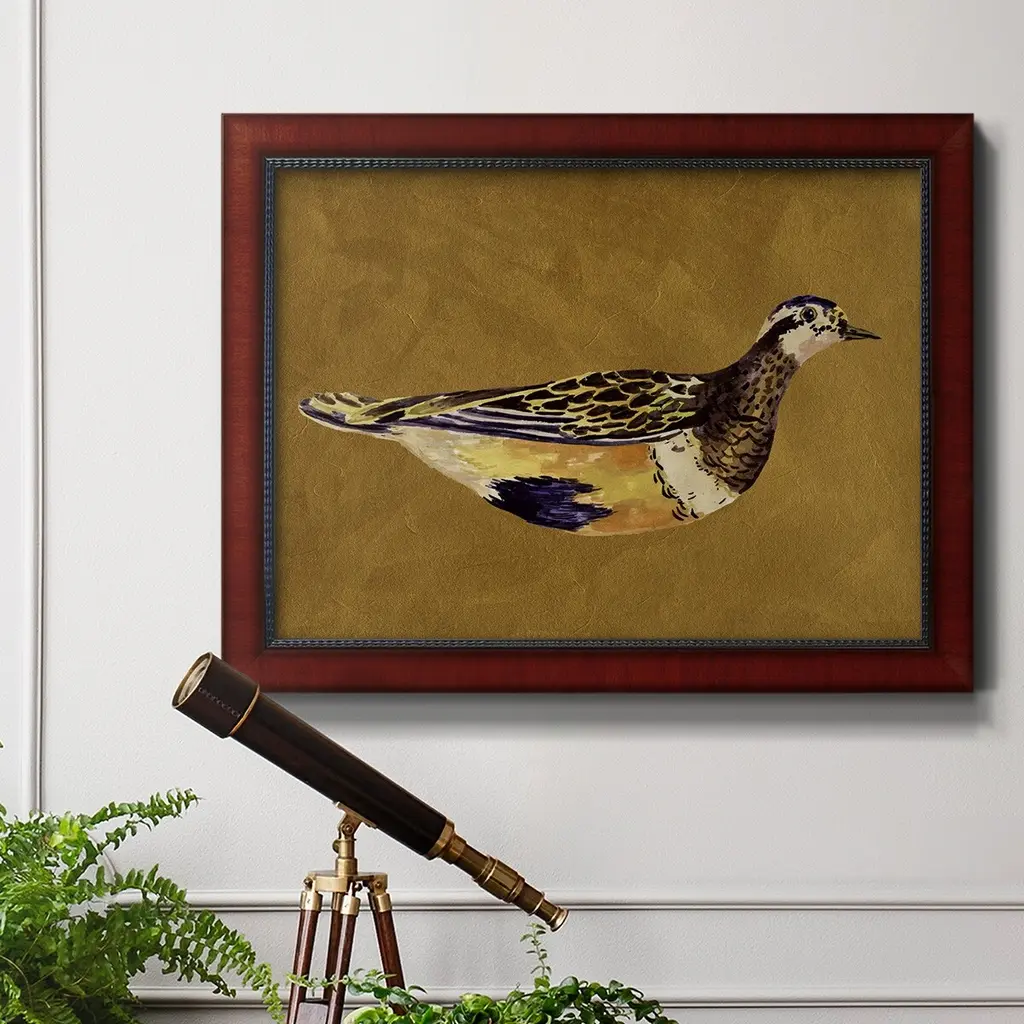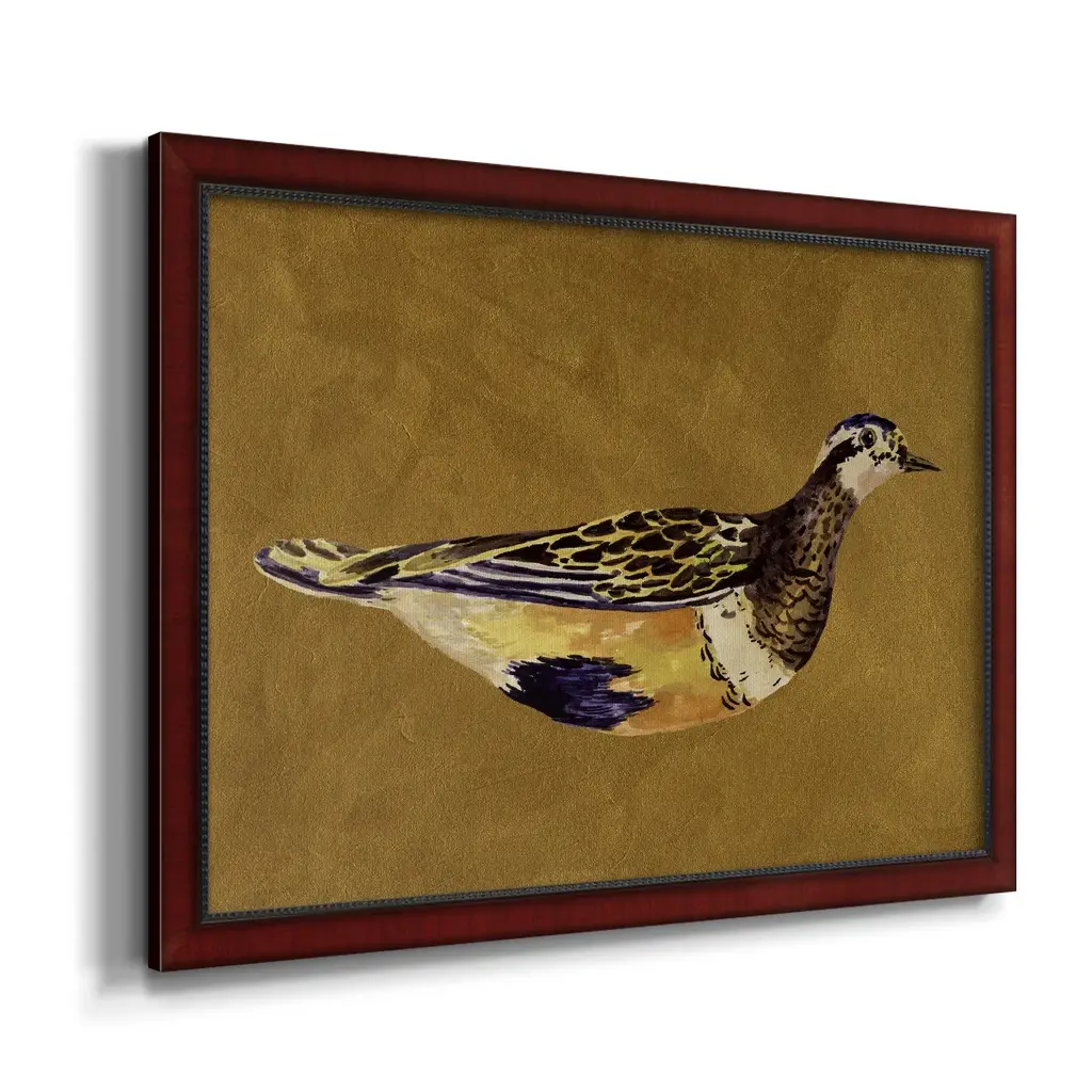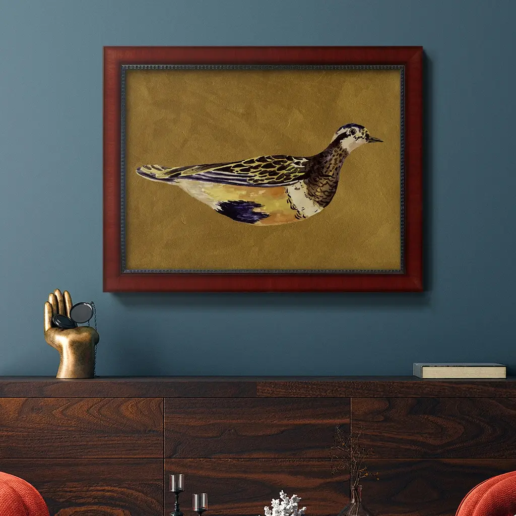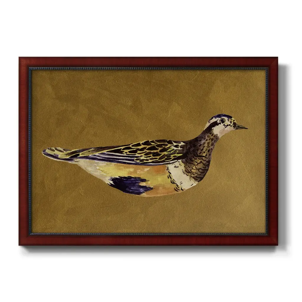 Feathered Friend II Premium Framed Canvas- Ready to Hang A Premium Framed Canvas created to last. Framed in distressed wood and available in an array of sizes and colors Featuring a beveled a solid wood stretcher bar, each piece comes ready to hand 3 SIZES AVAILABLE 16''X20'' - Overall Size 18'X27'' - Overall Size 24''x36'' - Overall Size Each piece is made to order. Each piece comes with hanging hardware. Made in the USA Ready to Hang Giclee Paper Print Acrylic Glass Beveled Matt Board