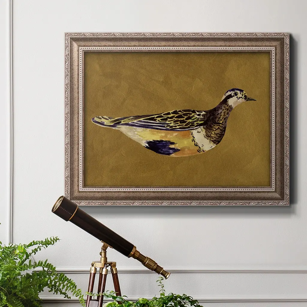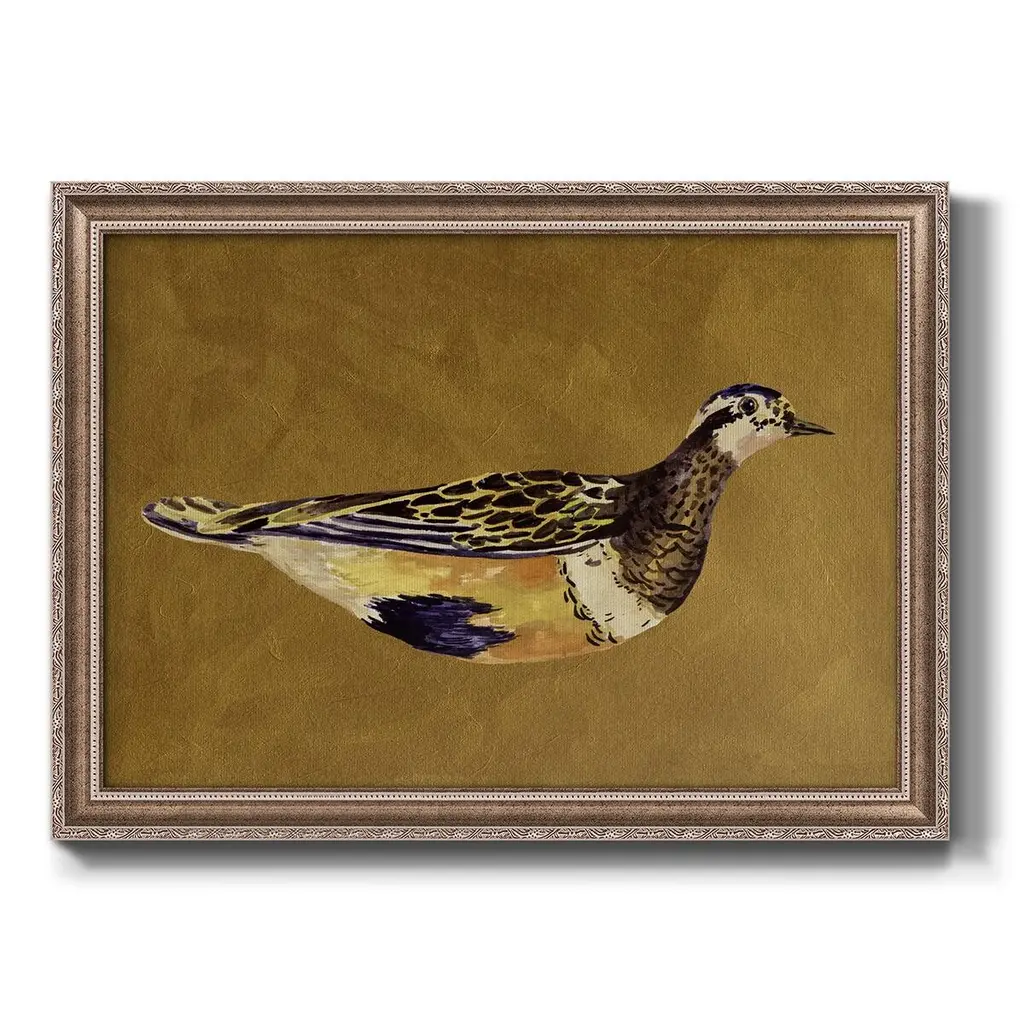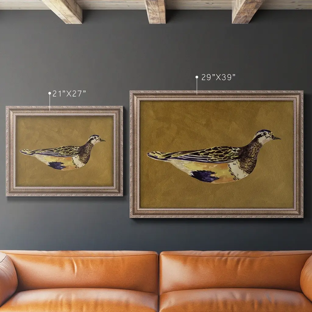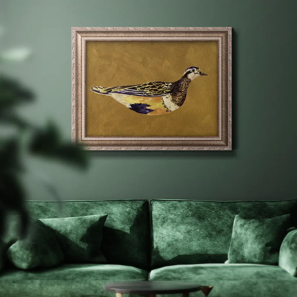 Feathered Friend II Premium Framed Canvas- Ready to Hang A Premium Framed Canvas created to last. Framed in distressed wood and available in an array of sizes and colors Featuring a beveled a solid wood stretcher bar, each piece comes ready to hand 3 SIZES AVAILABLE 16''X20'' - Overall Size 18'X27'' - Overall Size 24''x36'' - Overall Size Each piece is made to order. Each piece comes with hanging hardware. Made in the USA Ready to Hang Giclee Paper Print Acrylic Glass Beveled Matt Board