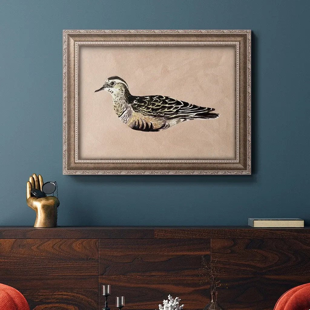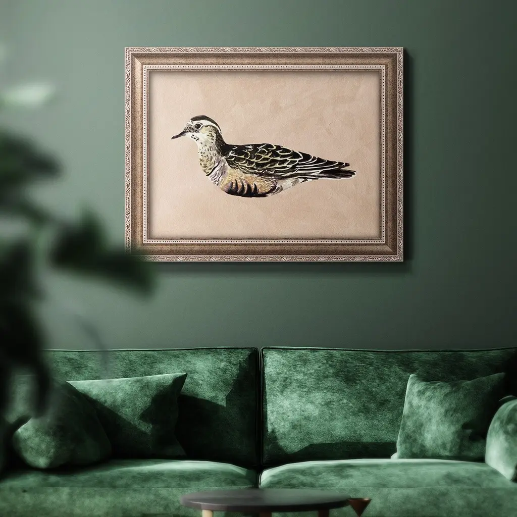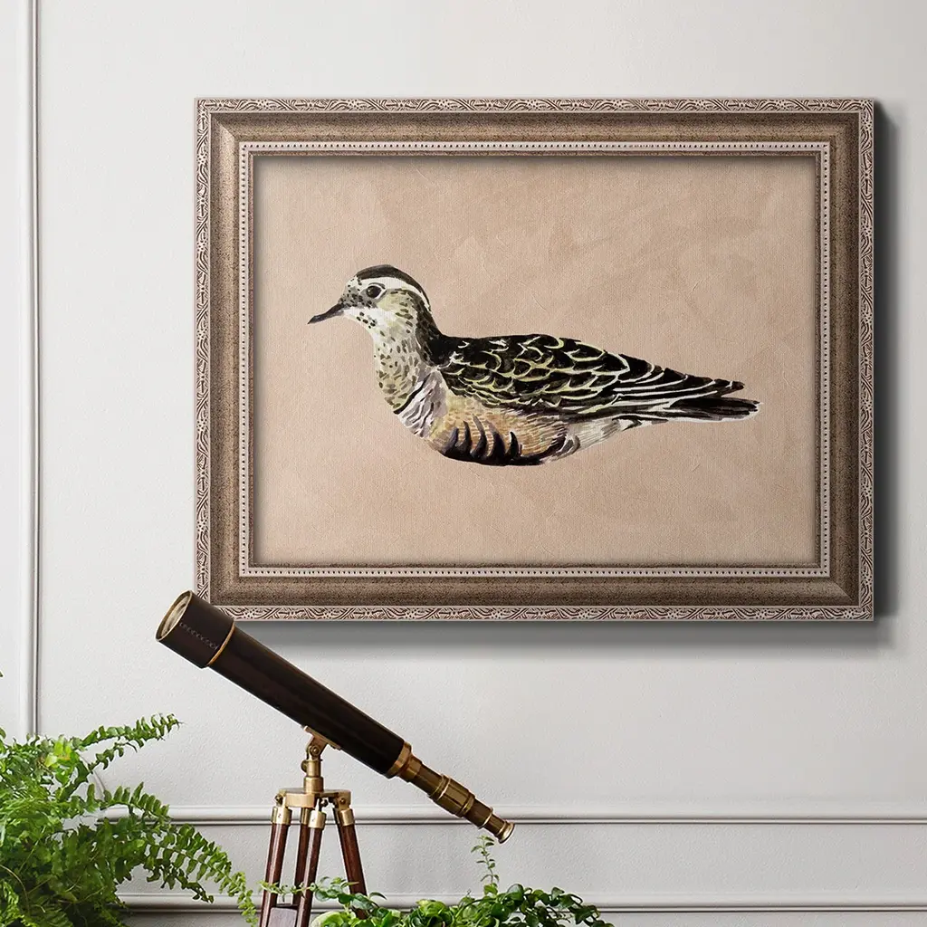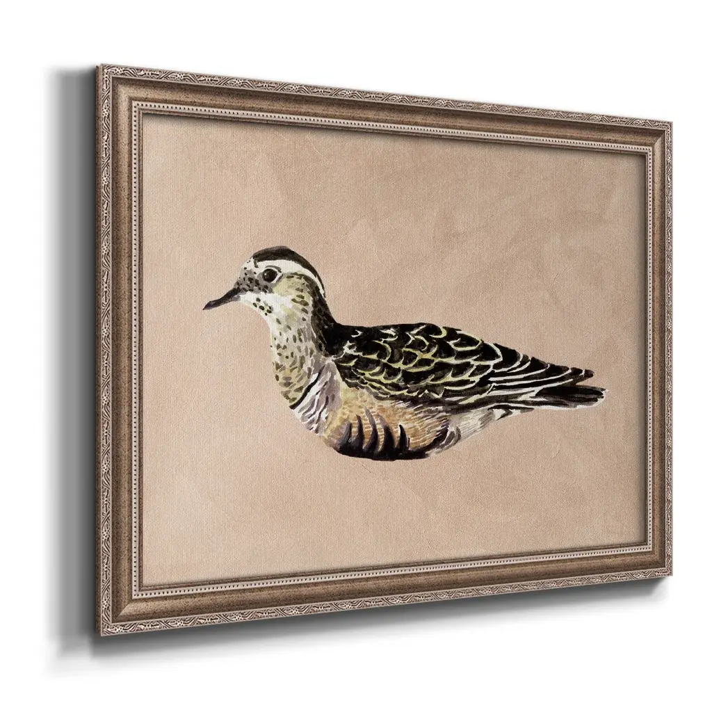 Feathered Friend III Premium Framed Canvas- Ready to Hang A Premium Framed Canvas created to last. Framed in distressed wood and available in an array of sizes and colors Featuring a beveled a solid wood stretcher bar, each piece comes ready to hand 3 SIZES AVAILABLE 16''X20'' - Overall Size 18'X27'' - Overall Size 24''x36'' - Overall Size Each piece is made to order. Each piece comes with hanging hardware. Made in the USA Ready to Hang Giclee Paper Print Acrylic Glass Beveled Matt Board