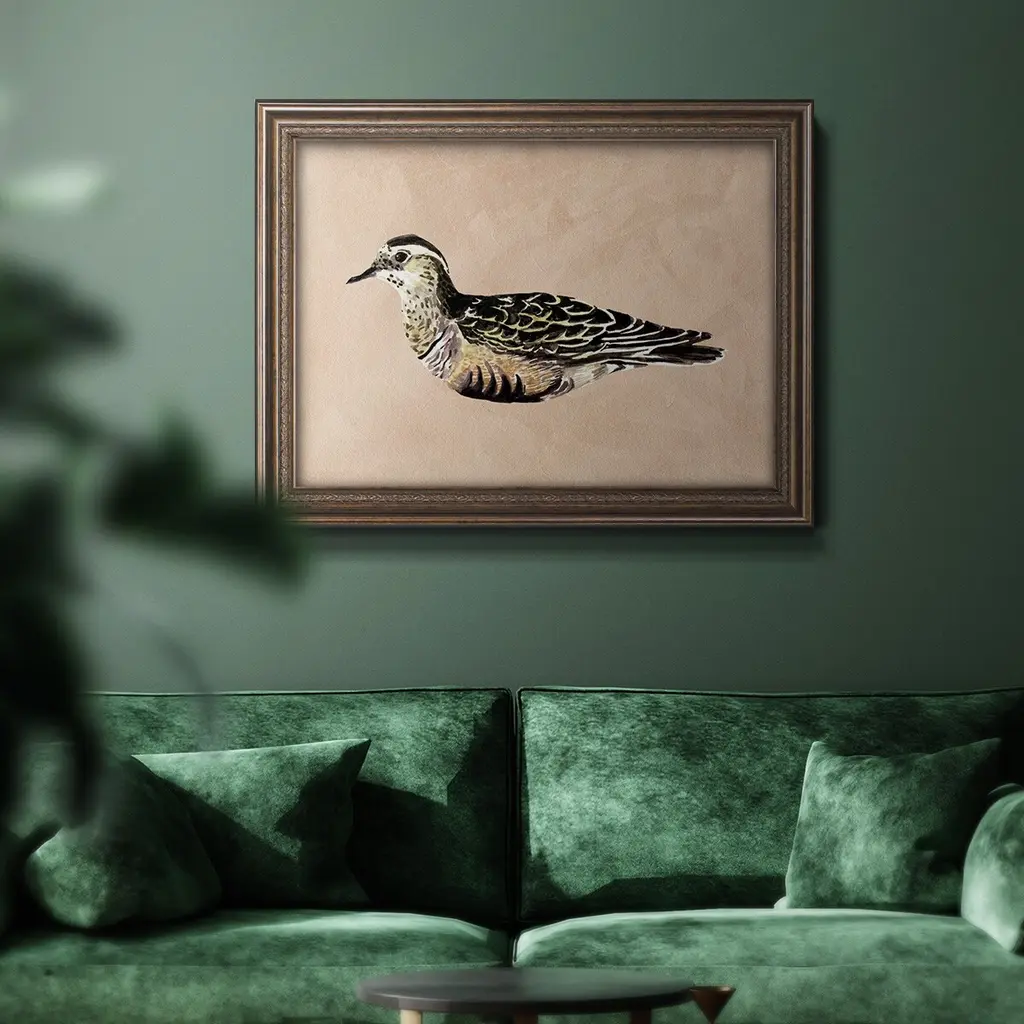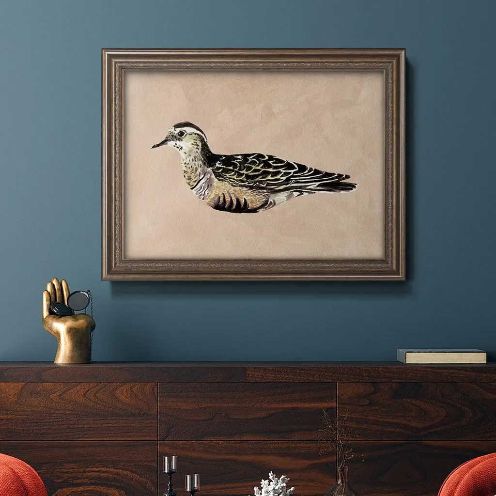 Feathered Friend III Premium Framed Canvas- Ready to Hang A Premium Framed Canvas created to last. Framed in distressed wood and available in an array of sizes and colors Featuring a beveled a solid wood stretcher bar, each piece comes ready to hand 3 SIZES AVAILABLE 16''X20'' - Overall Size 18'X27'' - Overall Size 24''x36'' - Overall Size Each piece is made to order. Each piece comes with hanging hardware. Made in the USA Ready to Hang Giclee Paper Print Acrylic Glass Beveled Matt Board