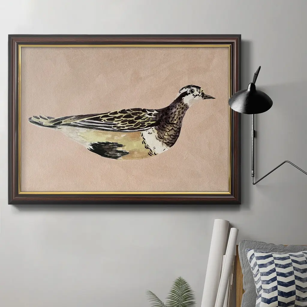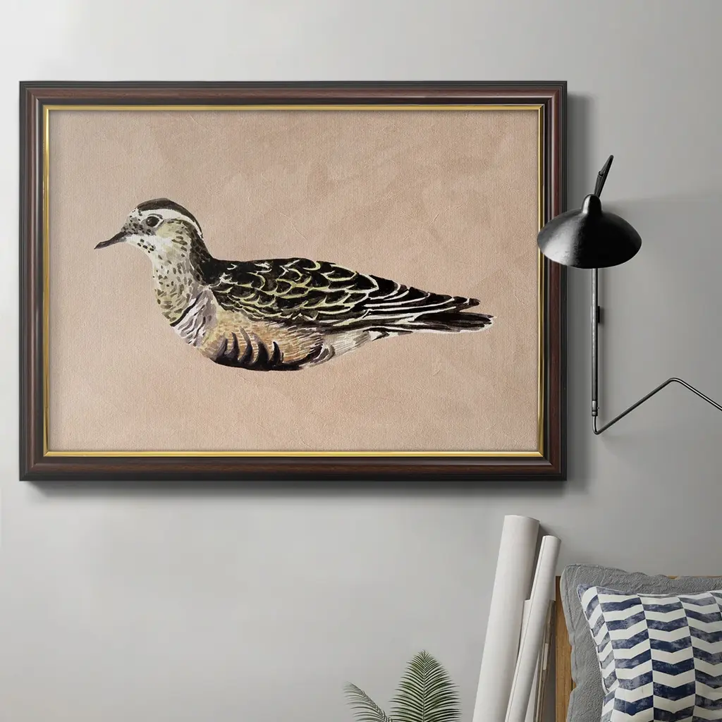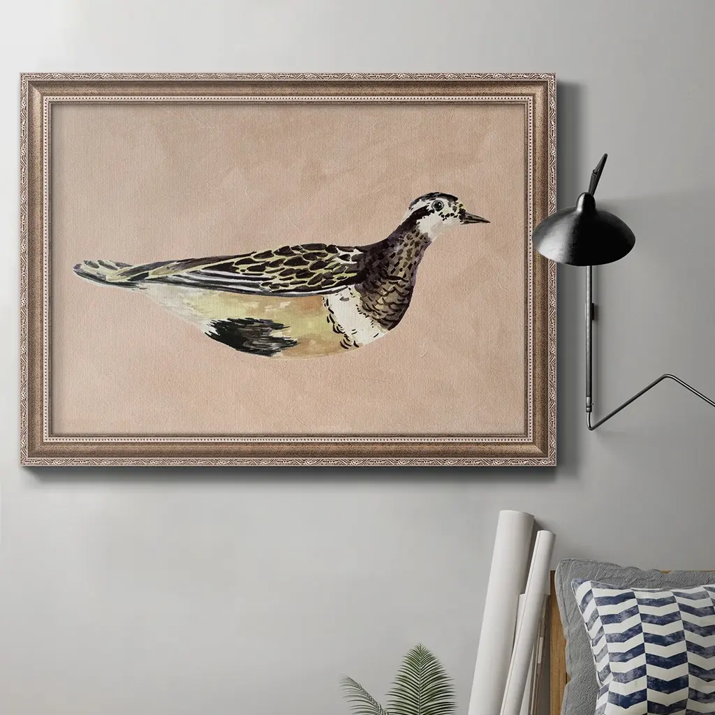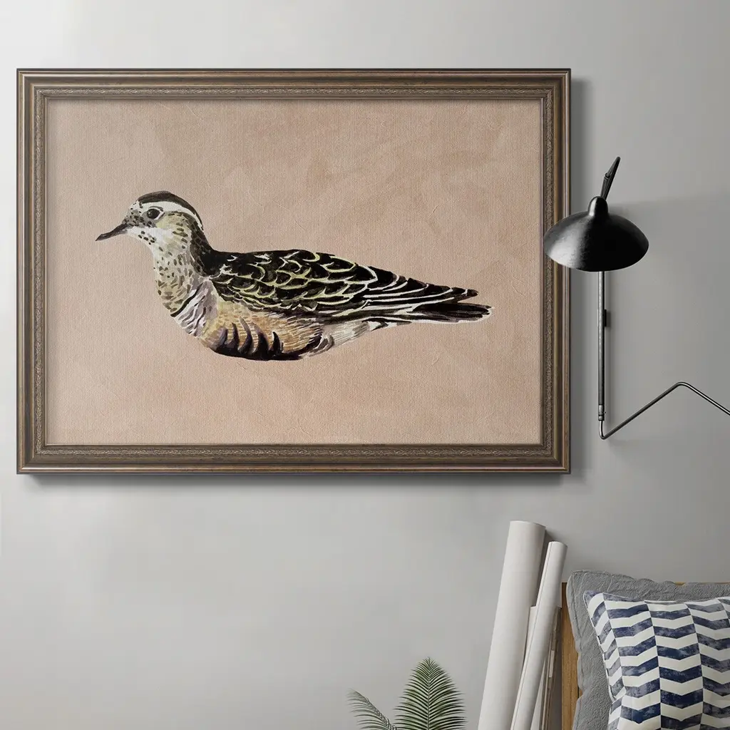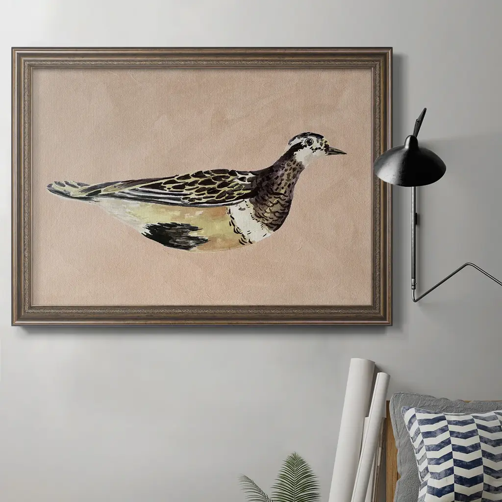 Feathered Friend IV Premium Framed Canvas- Ready to Hang A Premium Framed Canvas created to last. Framed in distressed wood and available in an array of sizes and colors Featuring a beveled a solid wood stretcher bar, each piece comes ready to hand 3 SIZES AVAILABLE 16''X20'' - Overall Size 18'X27'' - Overall Size 24''x36'' - Overall Size Each piece is made to order. Each piece comes with hanging hardware. Made in the USA Ready to Hang Giclee Paper Print Acrylic Glass Beveled Matt Board