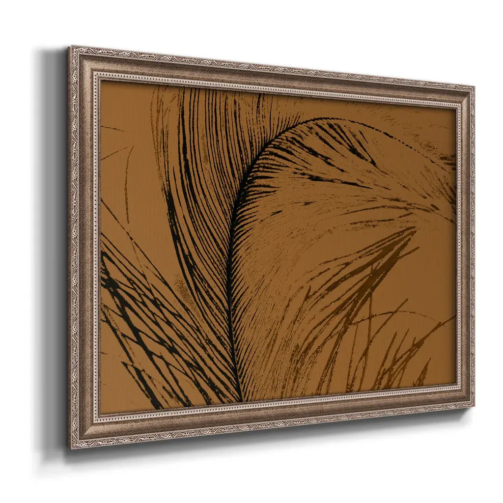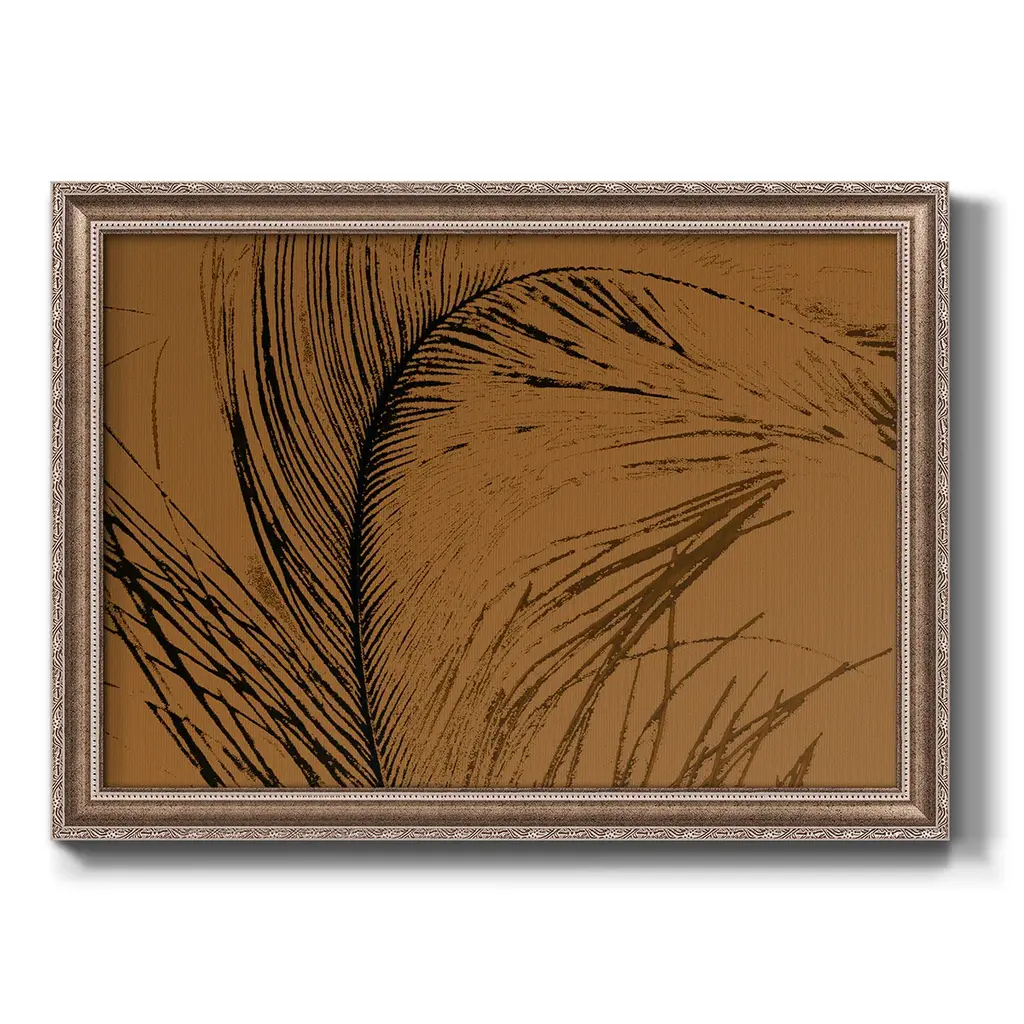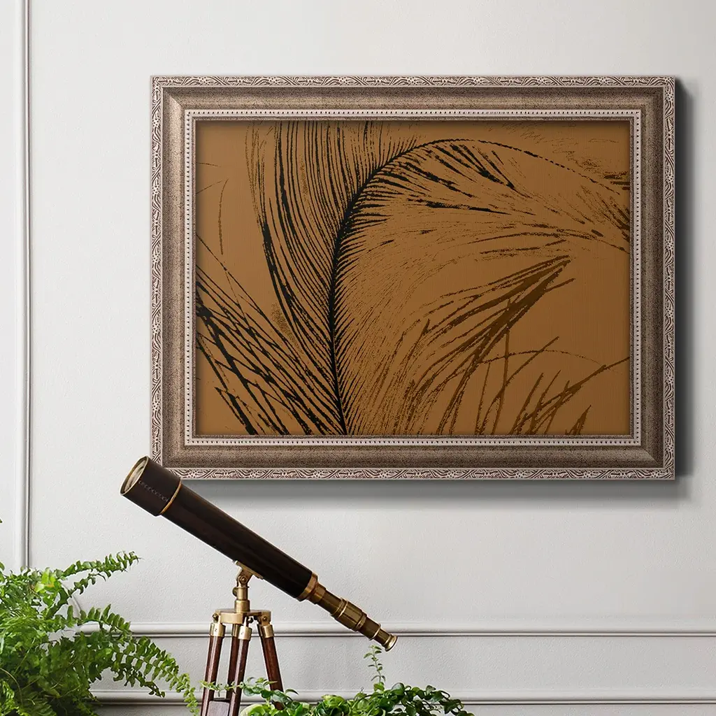 Feathered Impression I Premium Framed Canvas- Ready to Hang A Premium Framed Canvas created to last. Framed in distressed wood and available in an array of sizes and colors Featuring a beveled a solid wood stretcher bar, each piece comes ready to hand 3 SIZES AVAILABLE 16''X20'' - Overall Size 18'X27'' - Overall Size 24''x36'' - Overall Size Each piece is made to order. Each piece comes with hanging hardware. Made in the USA Ready to Hang Giclee Paper Print Acrylic Glass Beveled Matt Board