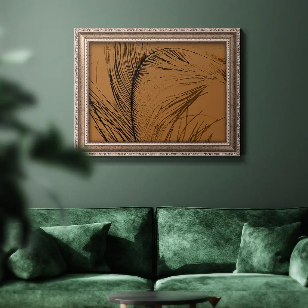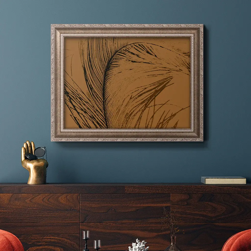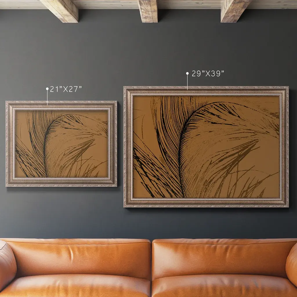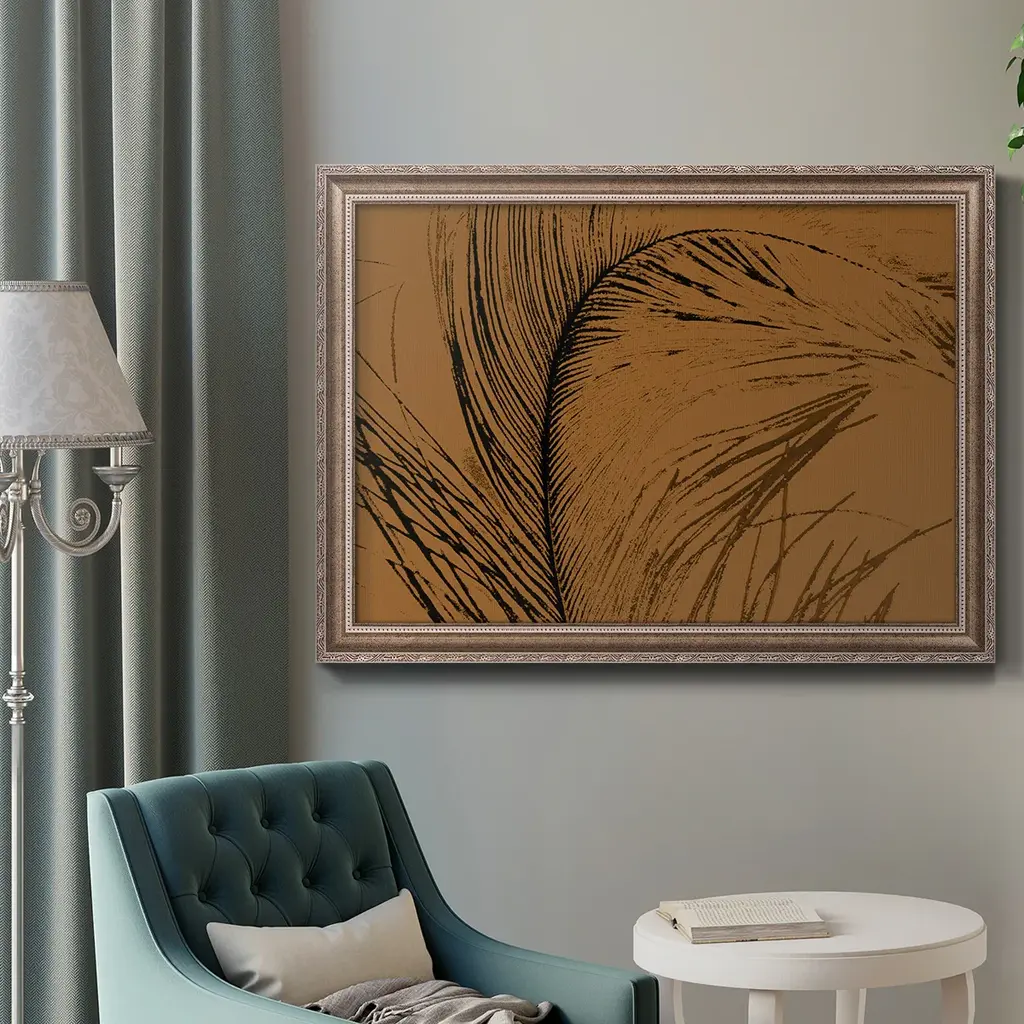 Feathered Impression I Premium Framed Canvas- Ready to Hang A Premium Framed Canvas created to last. Framed in distressed wood and available in an array of sizes and colors Featuring a beveled a solid wood stretcher bar, each piece comes ready to hand 3 SIZES AVAILABLE 16''X20'' - Overall Size 18'X27'' - Overall Size 24''x36'' - Overall Size Each piece is made to order. Each piece comes with hanging hardware. Made in the USA Ready to Hang Giclee Paper Print Acrylic Glass Beveled Matt Board