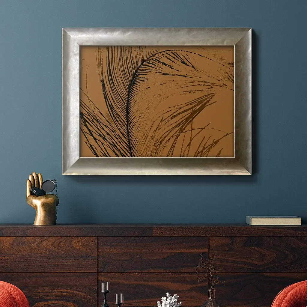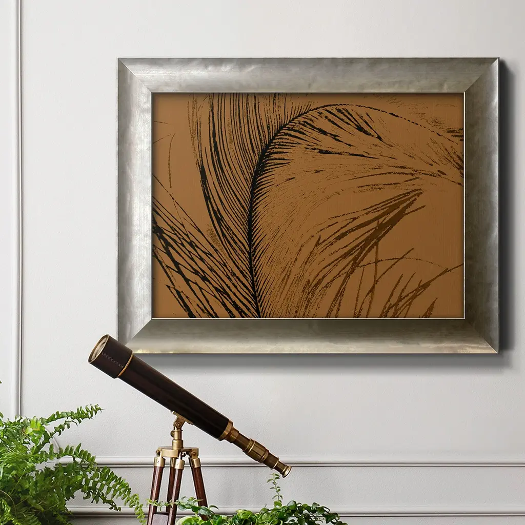 Feathered Impression I Premium Framed Canvas- Ready to Hang A Premium Framed Canvas created to last. Framed in distressed wood and available in an array of sizes and colors Featuring a beveled a solid wood stretcher bar, each piece comes ready to hand 3 SIZES AVAILABLE 16''X20'' - Overall Size 18'X27'' - Overall Size 24''x36'' - Overall Size Each piece is made to order. Each piece comes with hanging hardware. Made in the USA Ready to Hang Giclee Paper Print Acrylic Glass Beveled Matt Board