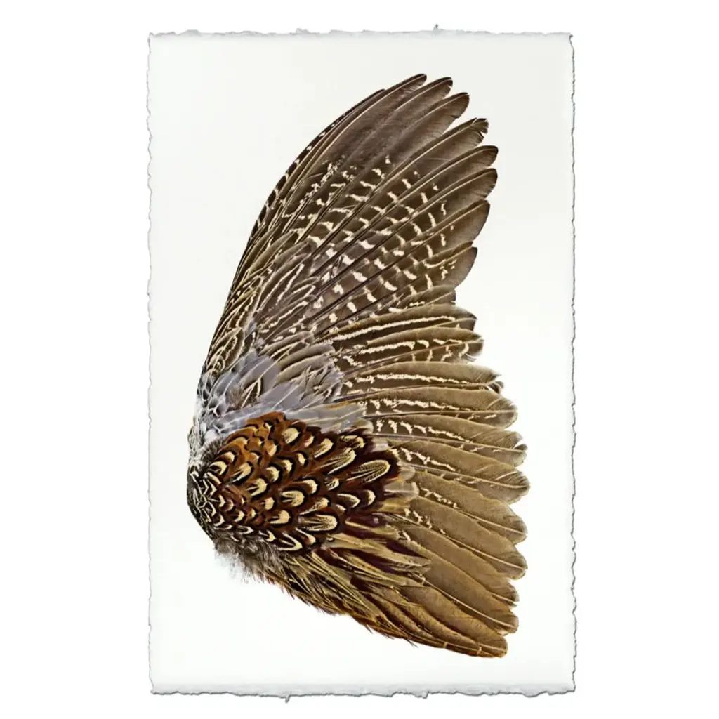 A stunning photograph of a pheasant wing is shown on delicate paper. Adding organic nature + style to any space. Pair with the pheasant left wing and create a pair for a stunning art display. Art pieces can either be unframed (print only), or framed in a choice of archival wood frames or within an image clear acrylic frame. If unframed, a choice of additional “frameless” hanging options are available. The added-on framing options are shipped disassembled from the artwork. Hanging kits come complete with everything needed to hang a single print, including easy instructions. No damage is done to the print upon utilizing the hangers.