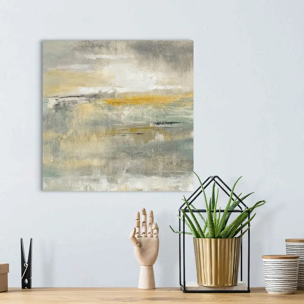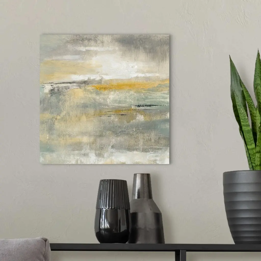 Square abstract painting with muted grey, green, and tan hues and pops of gold and black on top.