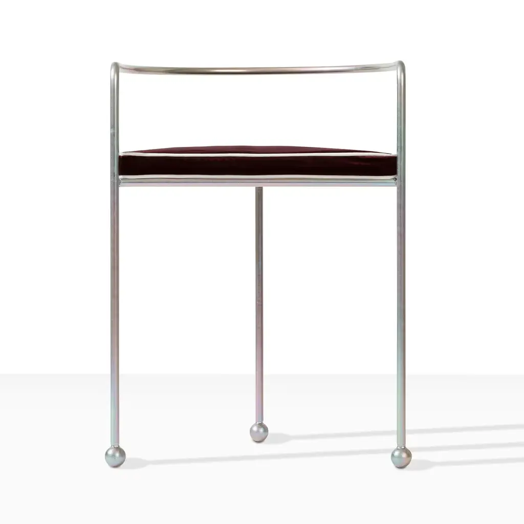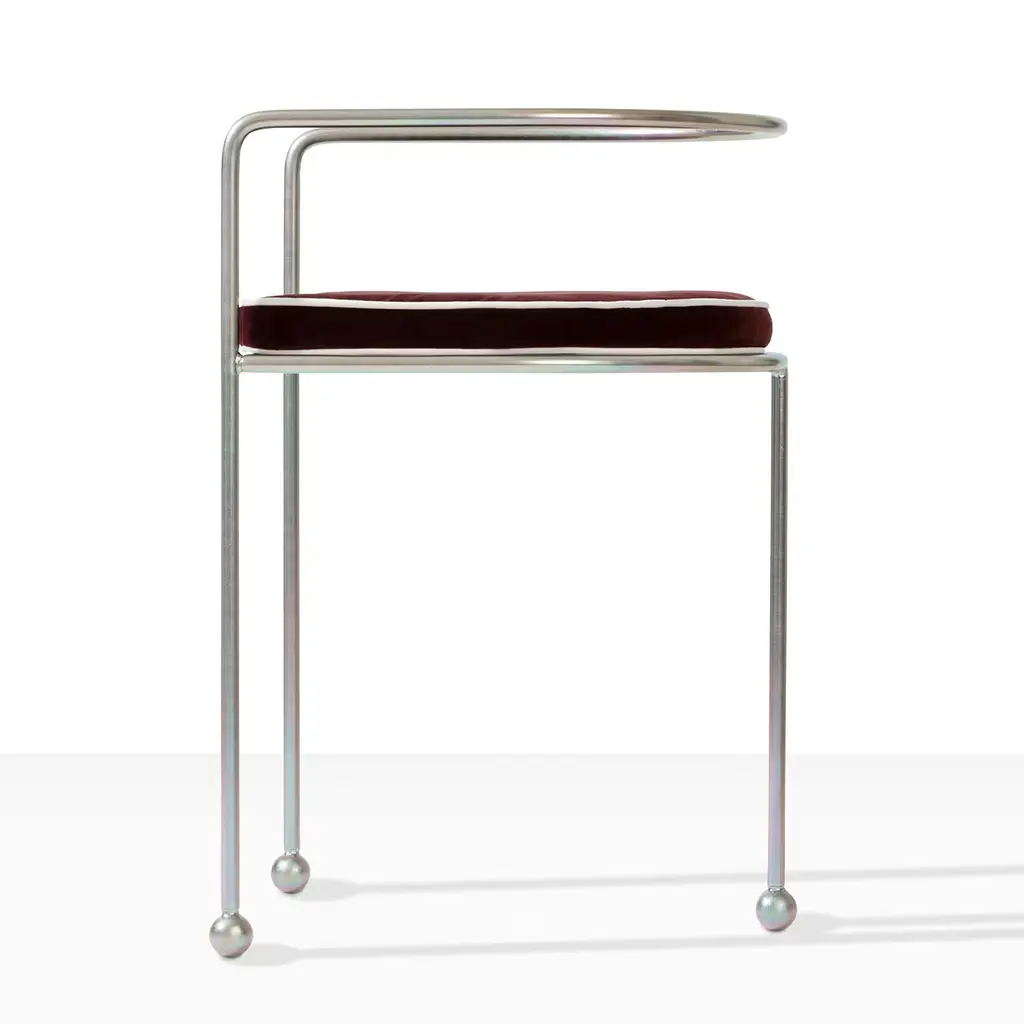 This handcrafted chair belongs to the Bacchetta capsule Collection, named after the manor once owned by the renowned Galliari architects. Comprised of essential, aerodynamic lines, the iron frame is treated with tropical galvanization for a specific tone evoking Baroque paintings. Slight differences from the pictured item are to be expected and considered charming qualities. Please contact the Concierge for fabric cover.