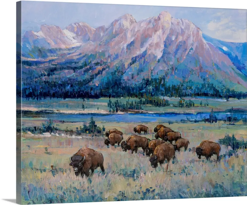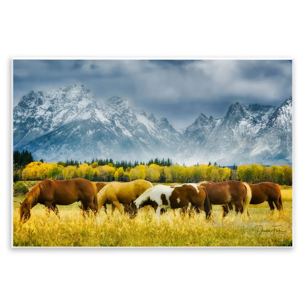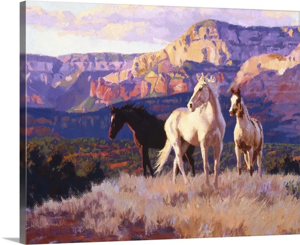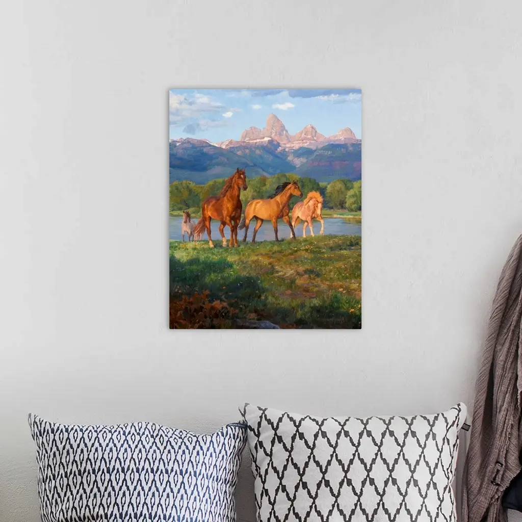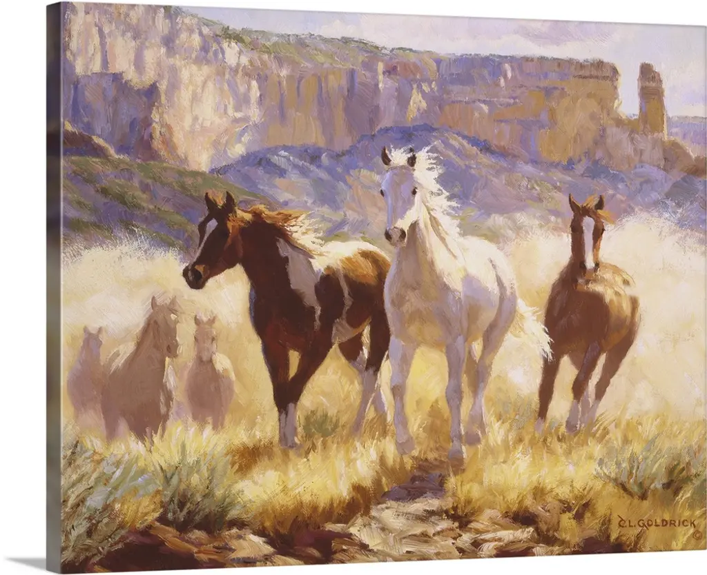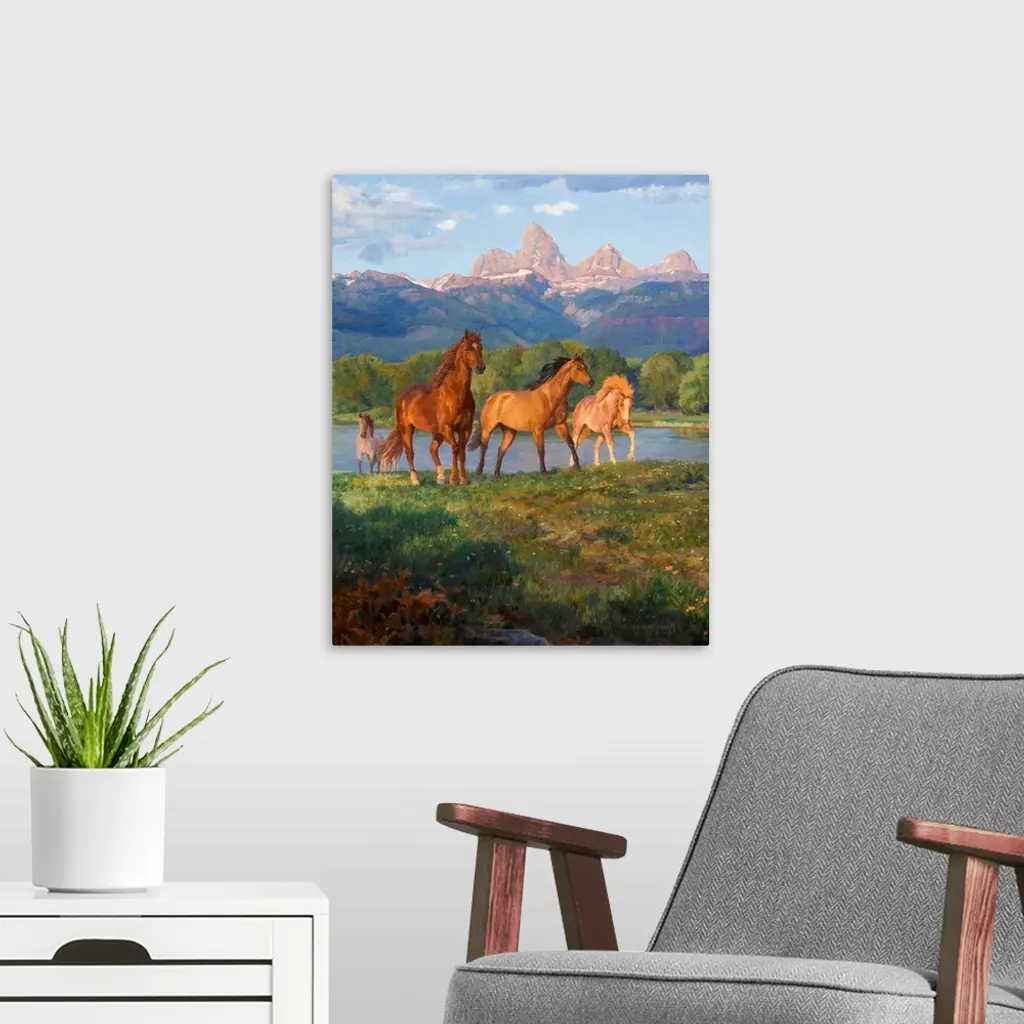 Contemporary colorful painting of a herd of horses running through a meadow, with a mountain range in the background.