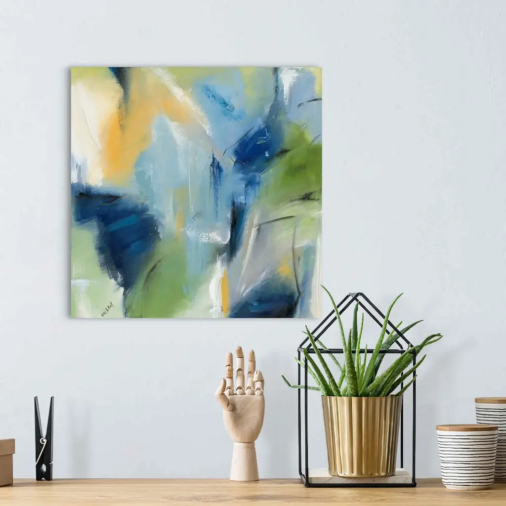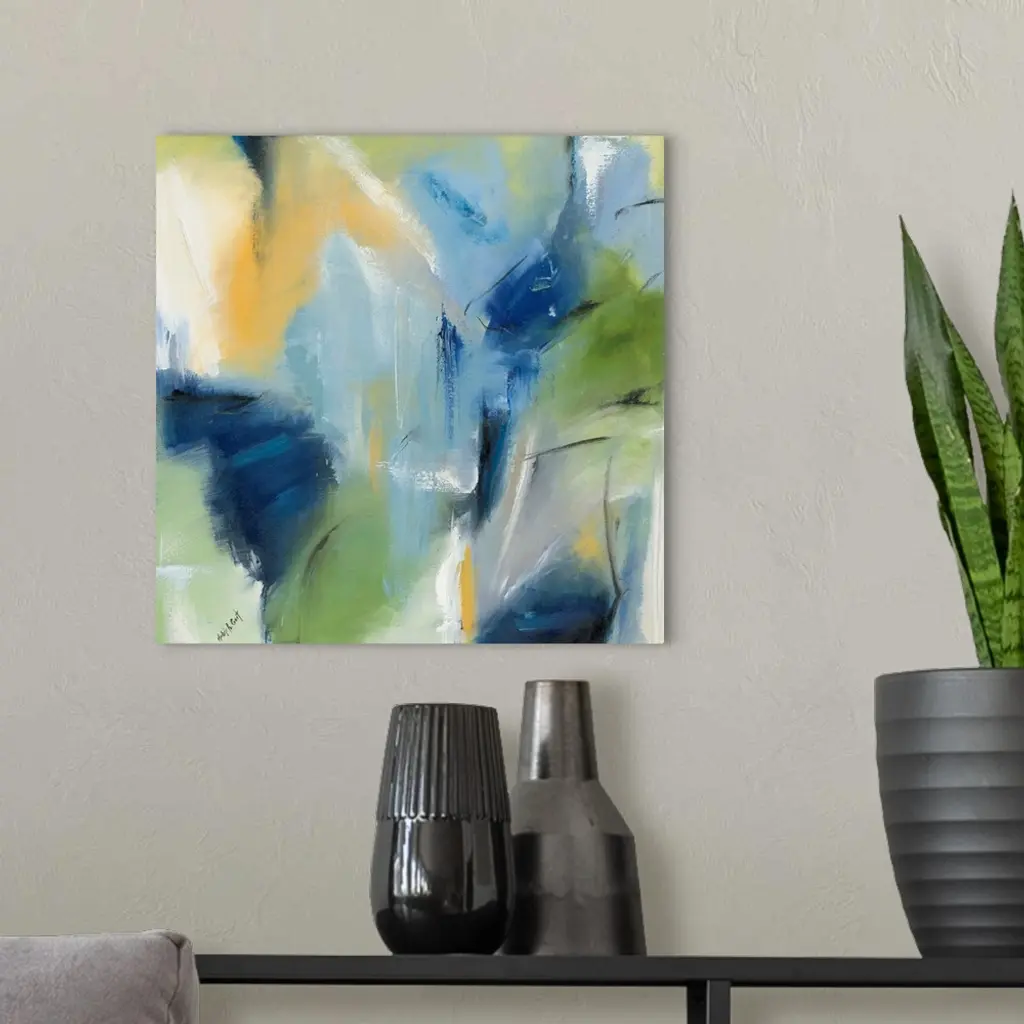 Square blue, green, and yellow abstract painting with black and white brushstrokes on top creating movement.