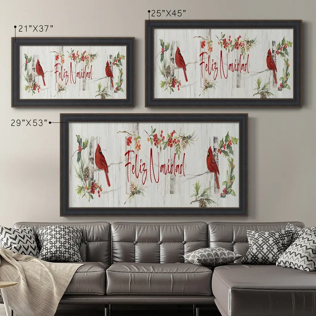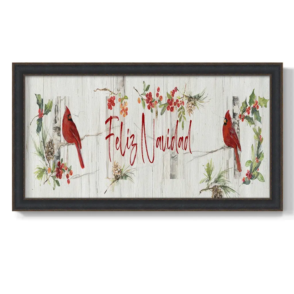 Feliz Navidad Premium Framed Canvas- Ready to Hang A Premium Framed Canvas created to last. Framed in distressed wood and available in an array of sizes and colors Featuring a beveled a solid wood stretcher bar, each piece comes ready to hand 3 SIZES AVAILABLE 21''X37'' - Overall Size 25''X45'' - Overall Size 29''x53'' - Overall Size Each piece is made to order. Each piece comes with hanging hardware. Made in the USA Ready to Hang Giclee Paper Print Acrylic Glass Beveled Matt Board