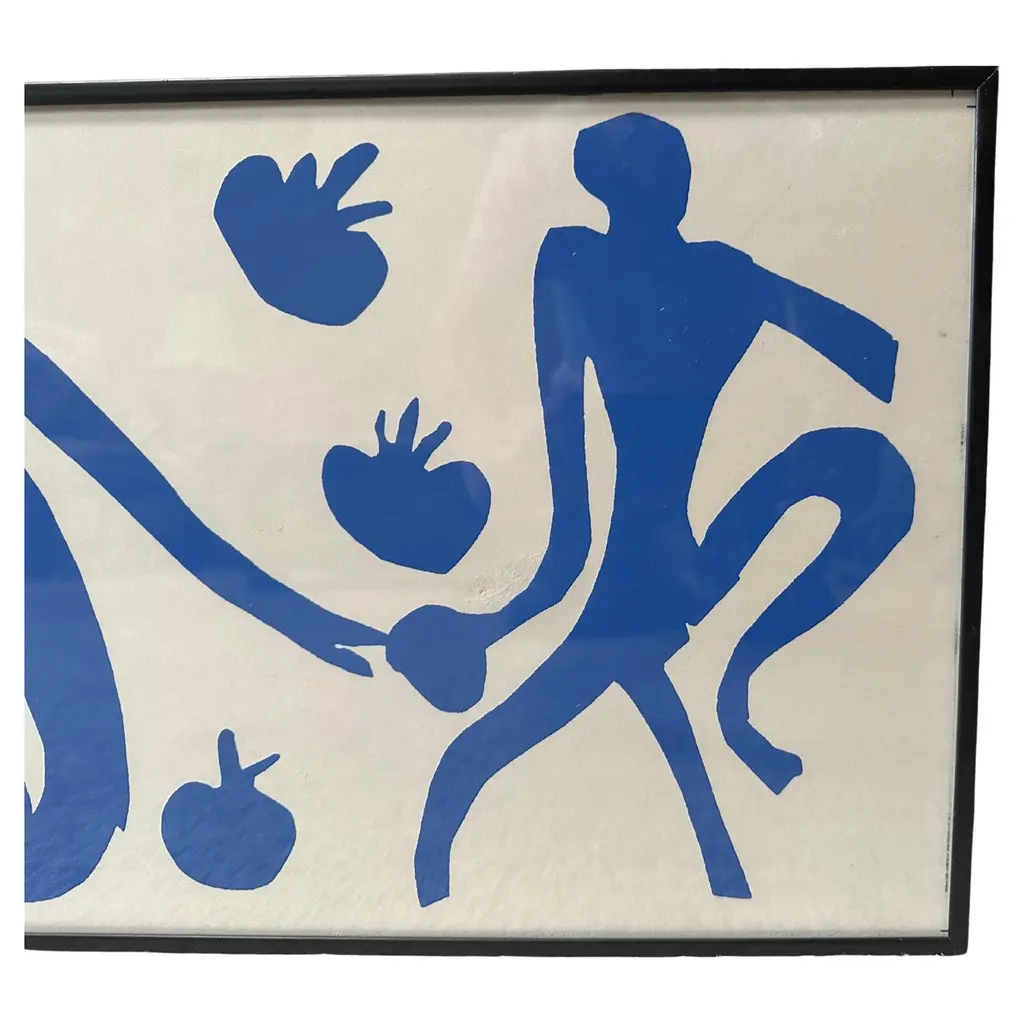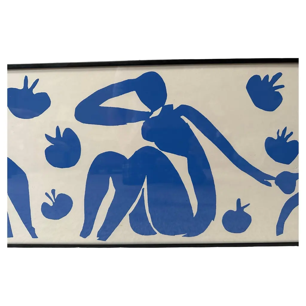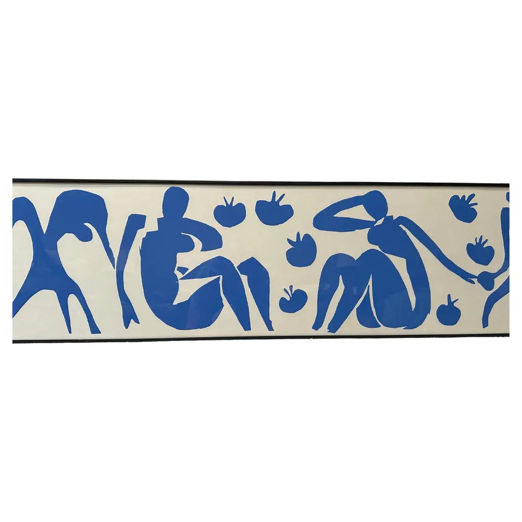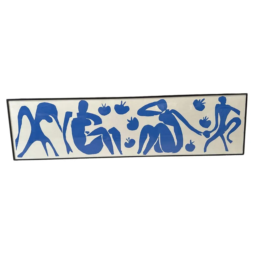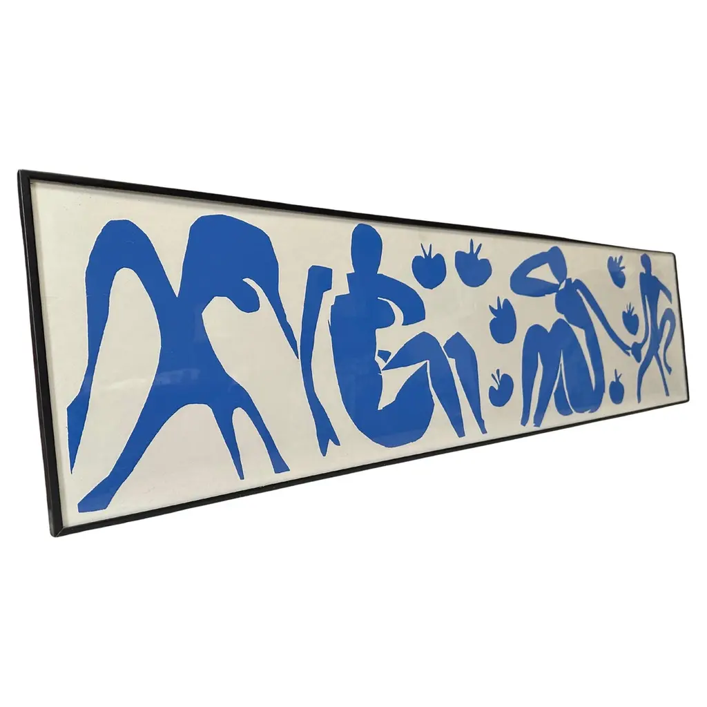 Vibrant "Femmes et Singes" (Women and Monkeys), a lithograph by the renowned French artist Henri Matisse, circa 1970s. Excellent fresh impression originally created toward the end of Matisse's life, from 1950 to 1954, and is part of a series of brightly colored gouache paper cut-outs. Matisse personally directed and supervised the first prints of this work in collaboration with Mourlot Freres of Paris. The lithographs were later published posthumously in 1958 in the French art review Verve, celebrating Matisse's final works. "Femmes et Singes" exemplifies Matisse's late-career focus on simplified human figures and bold, flat fields of color, reflecting his mastery of expressive color and form. The framed piece is 12" x 44". Artist: Henri Matisse (1869 - 1954)Title: "Femmes et Singes" (Women and Monkeys)Medium: Lithograph Framed size: 43.88" x 12" Condition: Excellent. #4461RMThe original artwork was created in 1952 as a gouache on cut paper. The original piece was reportedly hung above the door to Matisse's dining room in his apartment in Nice. Several editions of prints were made, including lithographs and serigraphs. Some were printed posthumously in 1958 for the art magazine "Verve", celebrating Matisse's last works. Matisse used the "cut-out" technique after arthritis made it difficult for him to paint, cutting shapes from painted pater and arranging them to create compositions. "Femmes et Singes" reflects Matisse's vibrant color palettes, expressive forms, and simplified figures, which were characteristic of his style and influenced the development of Fauvism and modernism.Henri Matisse was born on December 31, 1869, in Le Cateau-Cambrésis, France. At 22, he had given up studying law in Paris to pursue painting. He had briefly studied art at the Académie Julian and Ecole des Beaux-Arts with Gustave Moreau. At 32, Matisse exhibited at the Salon des Indépendants in Paris, where he met Maurice de Vlaminck, who with Matisse would eventually lead the Fauve art movement.Matisse's work was included in the 1913 Armory Show in New York, and throughout the 1910s and into the 1920s, his work began to find collectors around the world. Throughout the 1920s and 1930s, he divided his time between Paris and southern France, producing paintings, sculpture, lithographs, and etchings.Like many avant-garde artists in Paris, Matisse was receptive to a broad range of influences, particularly 'primitive' art, Near Eastern decorative art, African masks and sculpture, impressionist color, cubism, and the paintings of Paul Cezanne. The artist's images of the human face and figure -rendered in fluid lines and flat fields of color- typify these influences. Matisse argued for the prominence of instinct in art production, believing that an artist should not have complete control over color and form.He died on November 3, 1954, in Nice.