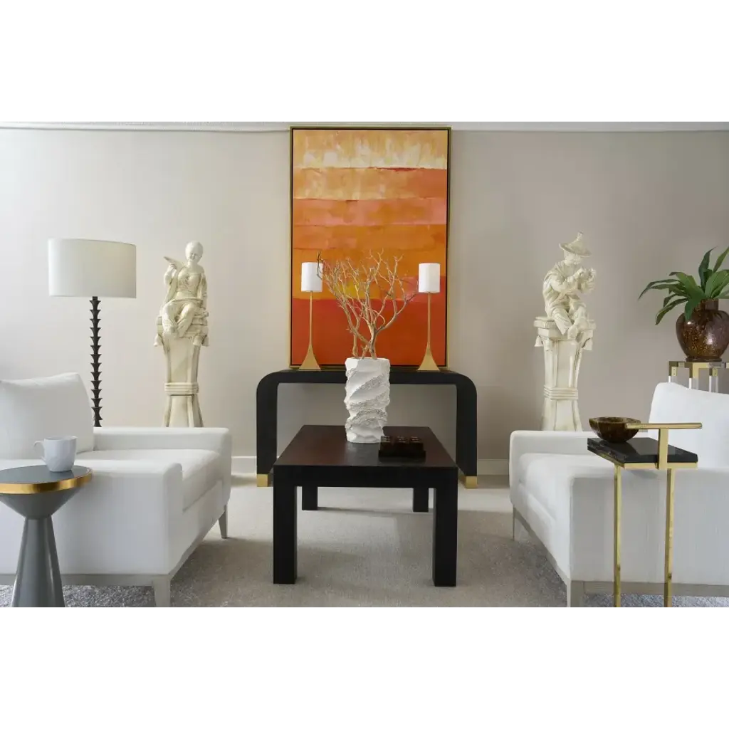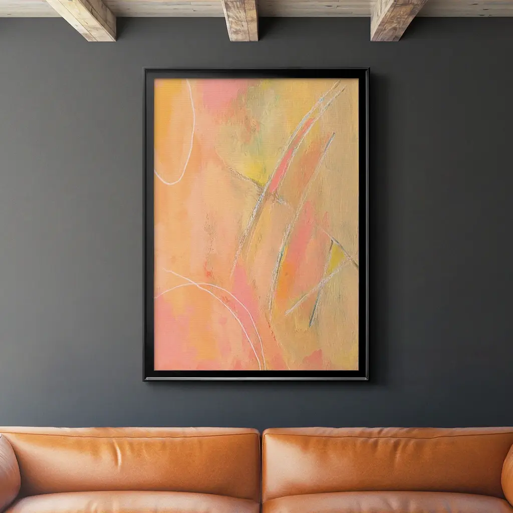 This hand-painted canvas art piece features a vibrant array of orange shades, creating a dynamic display. With abstract brushstrokes, it adds a contemporary touch. Finished with a wood frame.