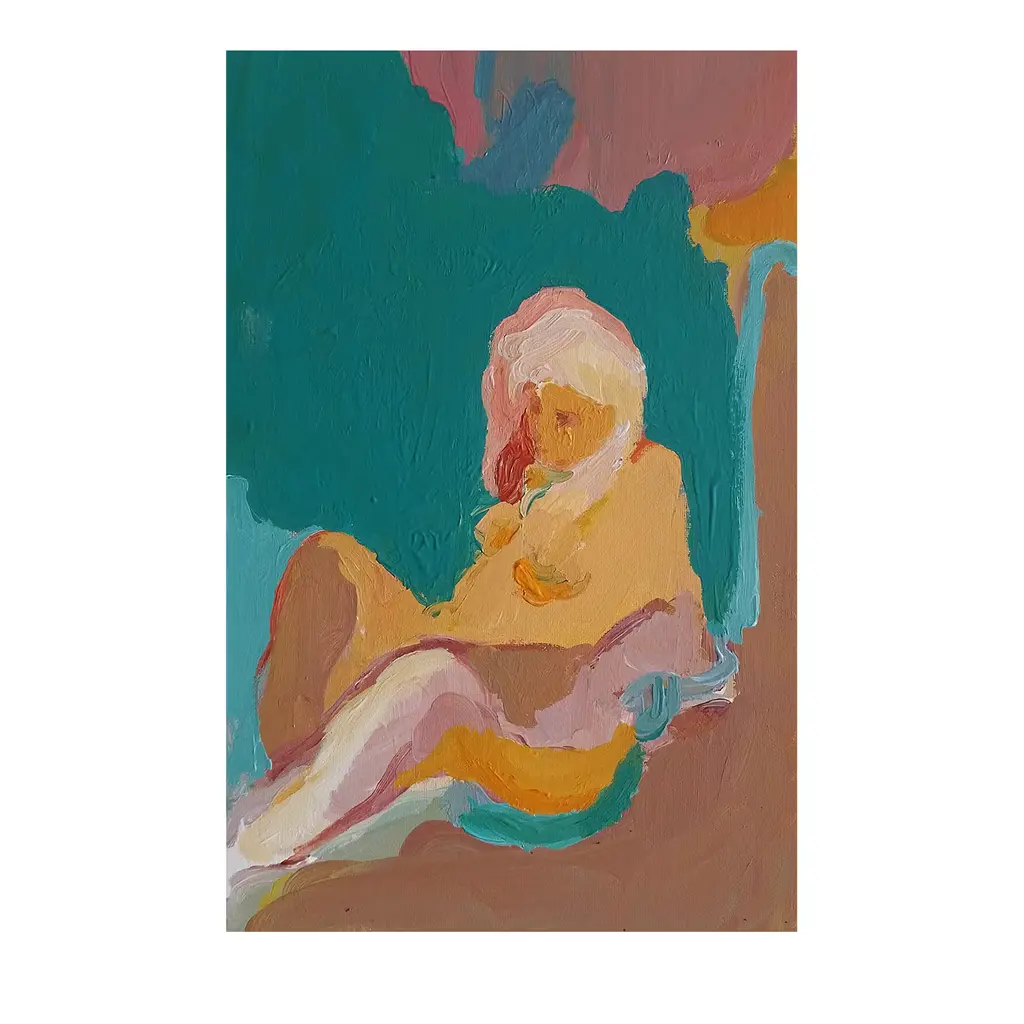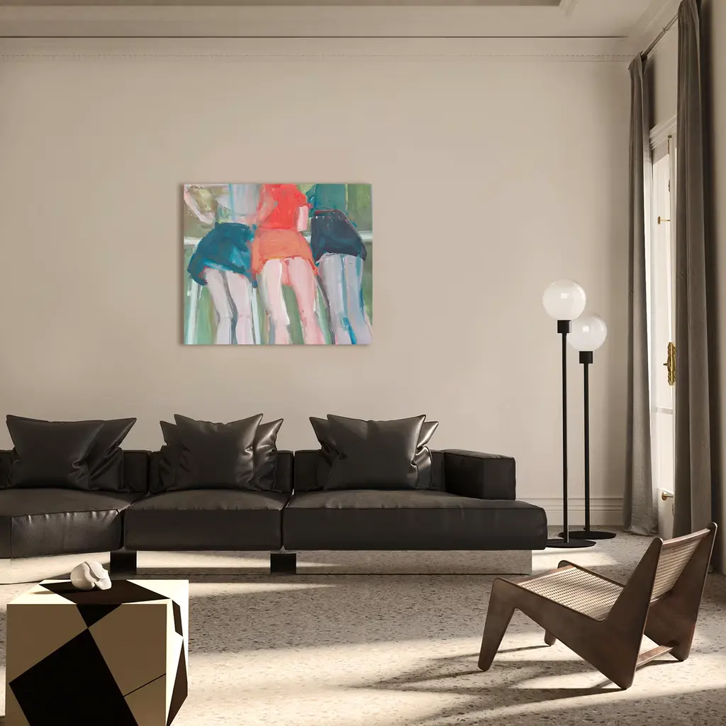 A statement of contemporary society, this extraordinary painting explores the concepts of identity and personality, of sexuality and gender. Stunning evocative shades enhance the dialogue with the past, embedded in the three female subjects, depicted from below to reveal their naked legs under colored mini-skirts. Please consult the Concierge for further information. This is a unique piece of art. Delivered with a certificate of authenticity. Frame not included.
