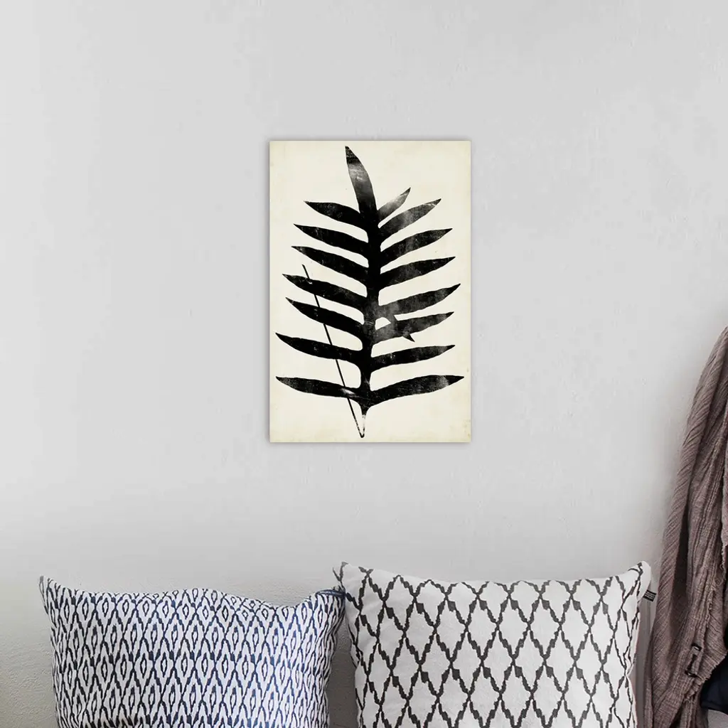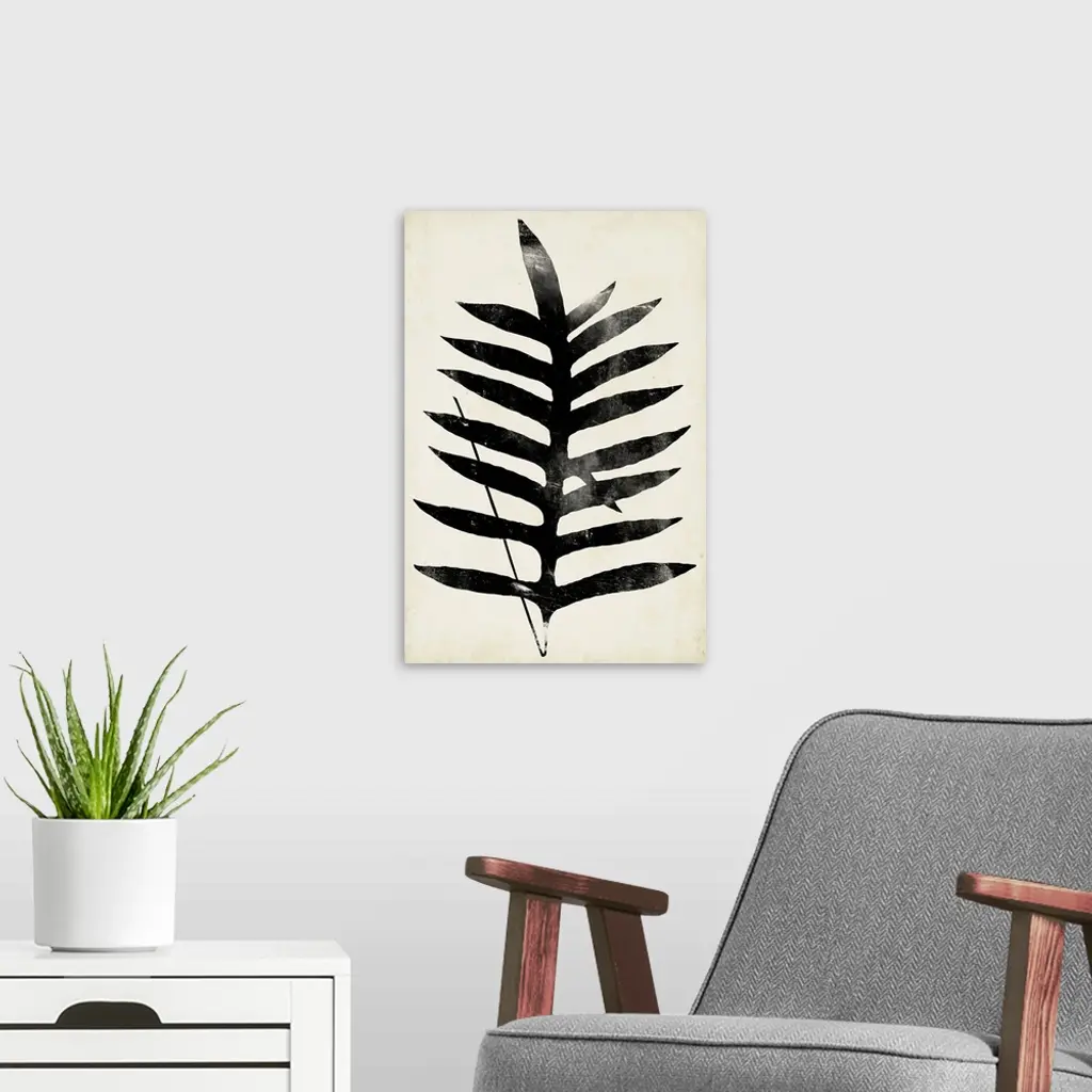 This contemporary artwork features a silhouette of a fern leaf over a neutral background with distressed textures throughout.