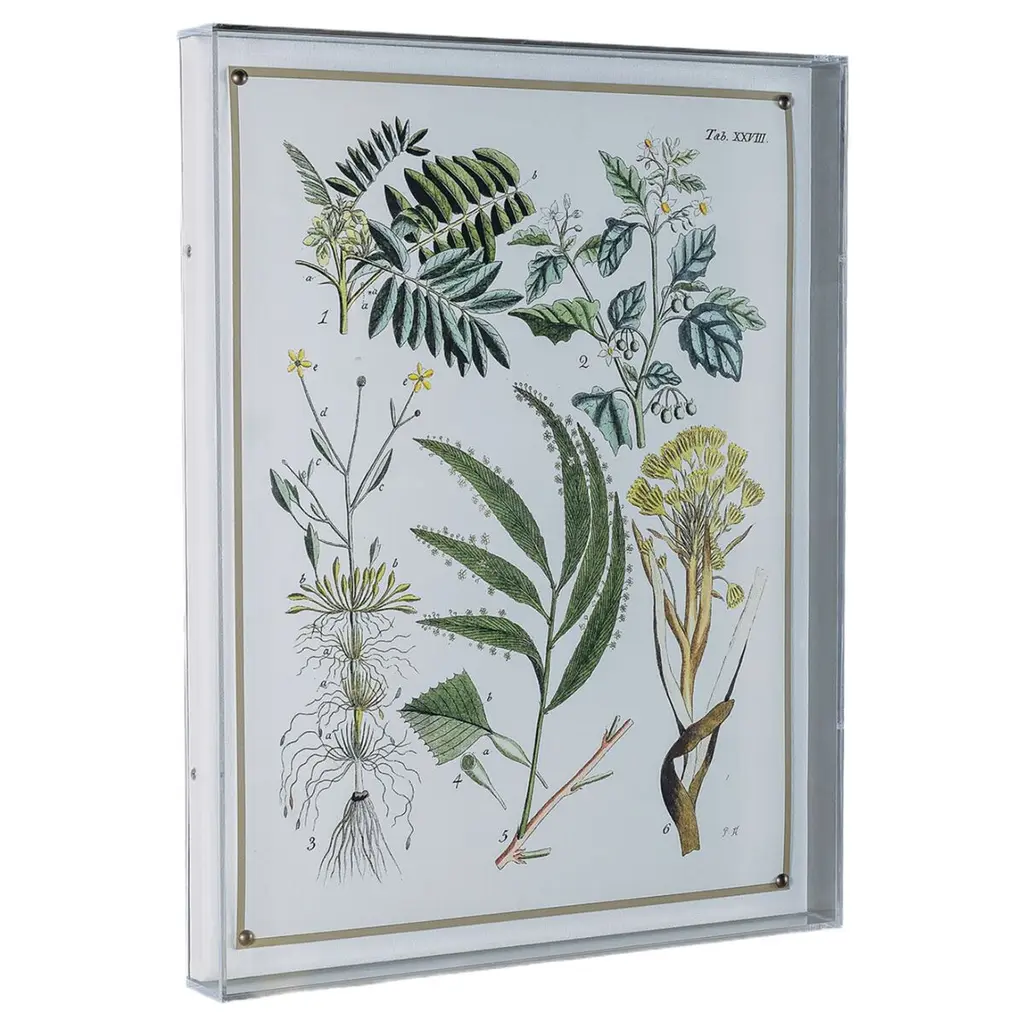 The artwork features a giclee print mounted under a deep lucite shadow box. Attached to a linen wrapped interior panel, the artwork is finished with brass nail head in each corner. Each panel is sold individually. Artwork may be hung individually or as a set with mates. Measurements: 26"H x 20"W x 2.5"D. Materials include an acrylic frame, interior board mount, and giclee paper print.