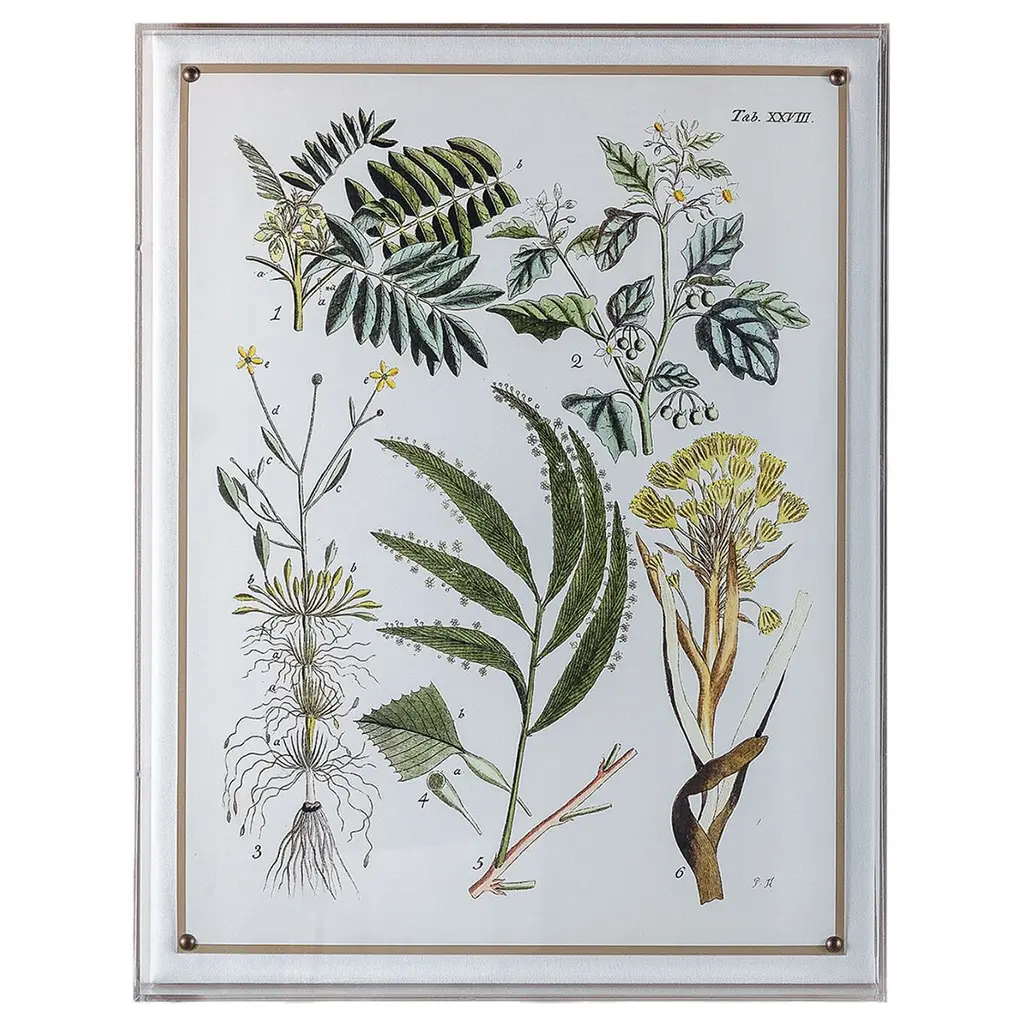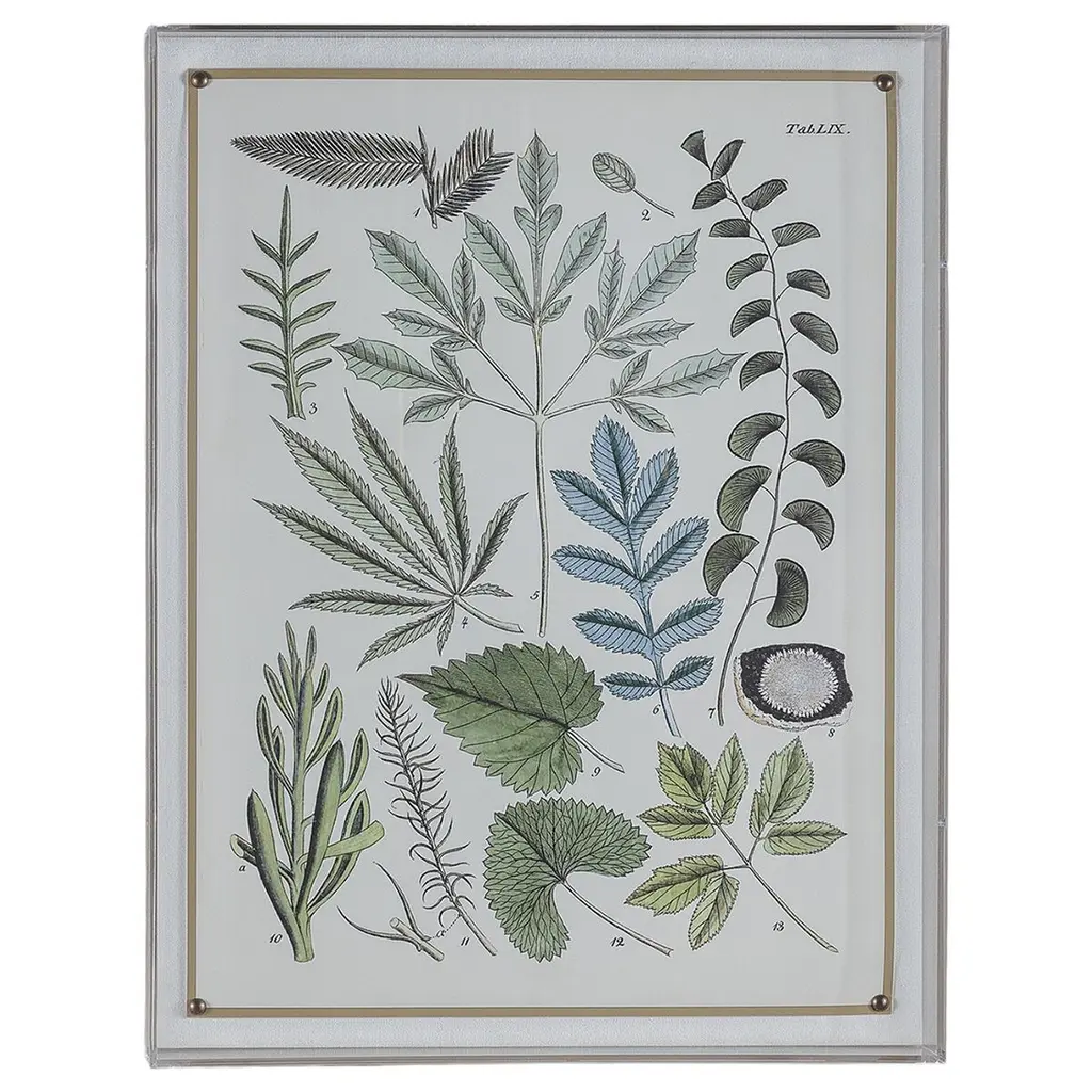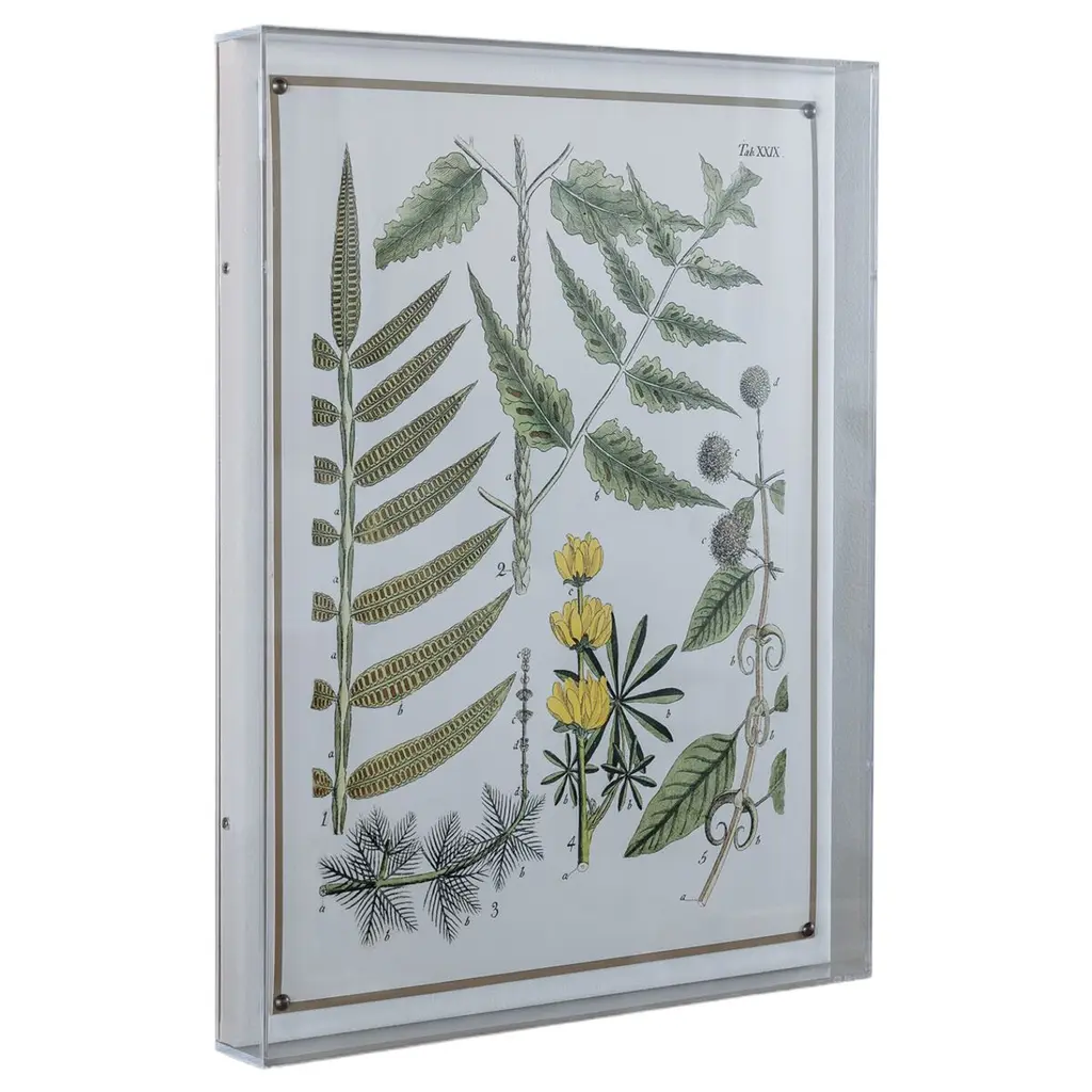 The artwork features a giclee print mounted under a deep lucite shadow box. Attached to a linen wrapped interior panel, the artwork is finished with brass nail head in each corner. Each panel is sold individually. Artwork may be hung individually, or as a set with mates. Measurements: 26"H x 20"W x 2.5"D. Materials: acrylic frame, interior board mount, giclee paper print.