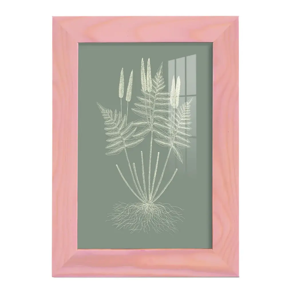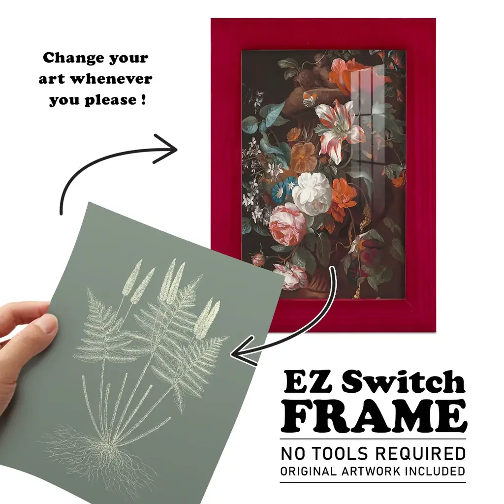 Ferns on Sage VII -EZ SWITCH Framed Print w/glass-Cherry Red A delightful, framed print. Featuring a solid wood frame with real wood glass. This premium print is giclee quality. In addition, every frame features a removable back and table top stand. This allows you to change your art in the future or to just stand the art on a table for a new look. We are sure you'll enjoy our new series of EZ SWITCH Framed Art. Solid Wood Frame Real Glass Removable / Replaceable Art Built in Tabletop Stand Sizes range from 4x6 up to 12x15 - buy just one or pair them up as sets as you see fit.